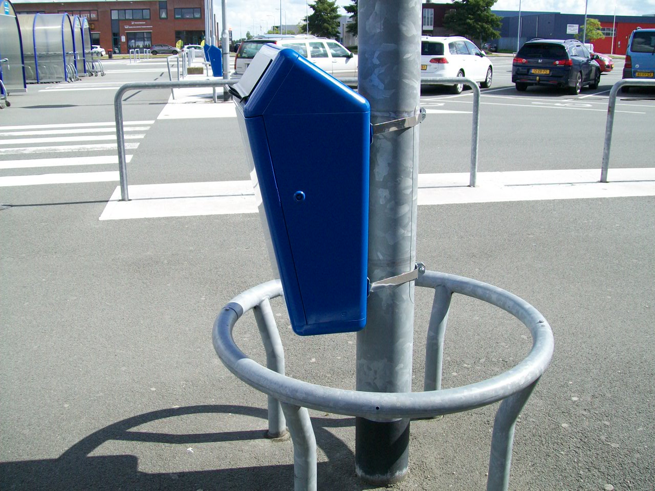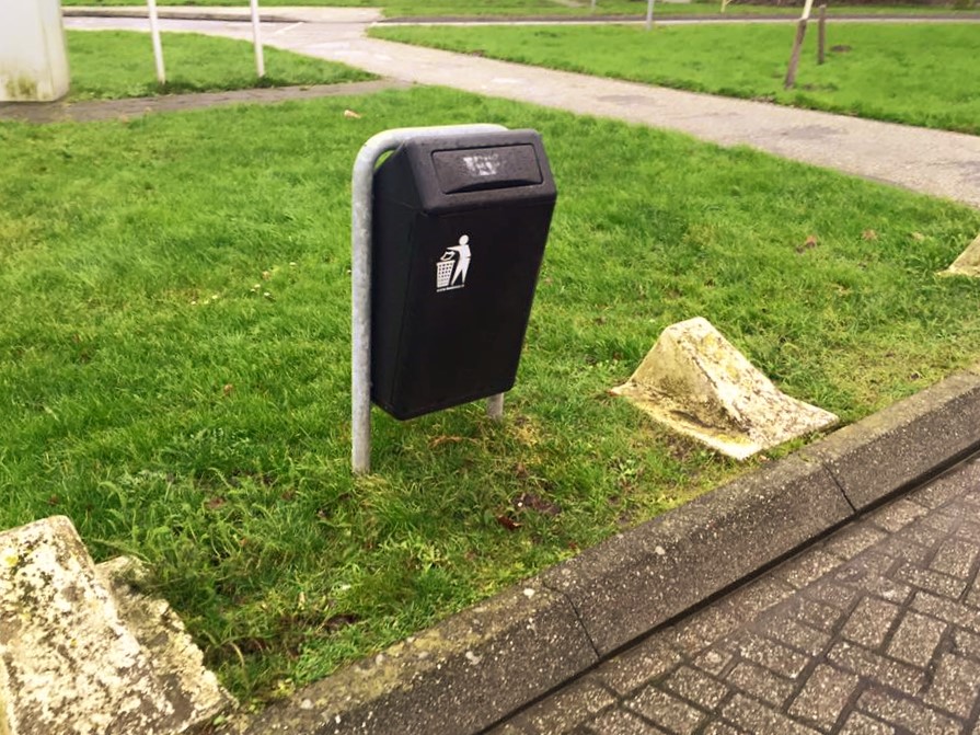 • triopole, 3 afvalbakken aan een staander op voet