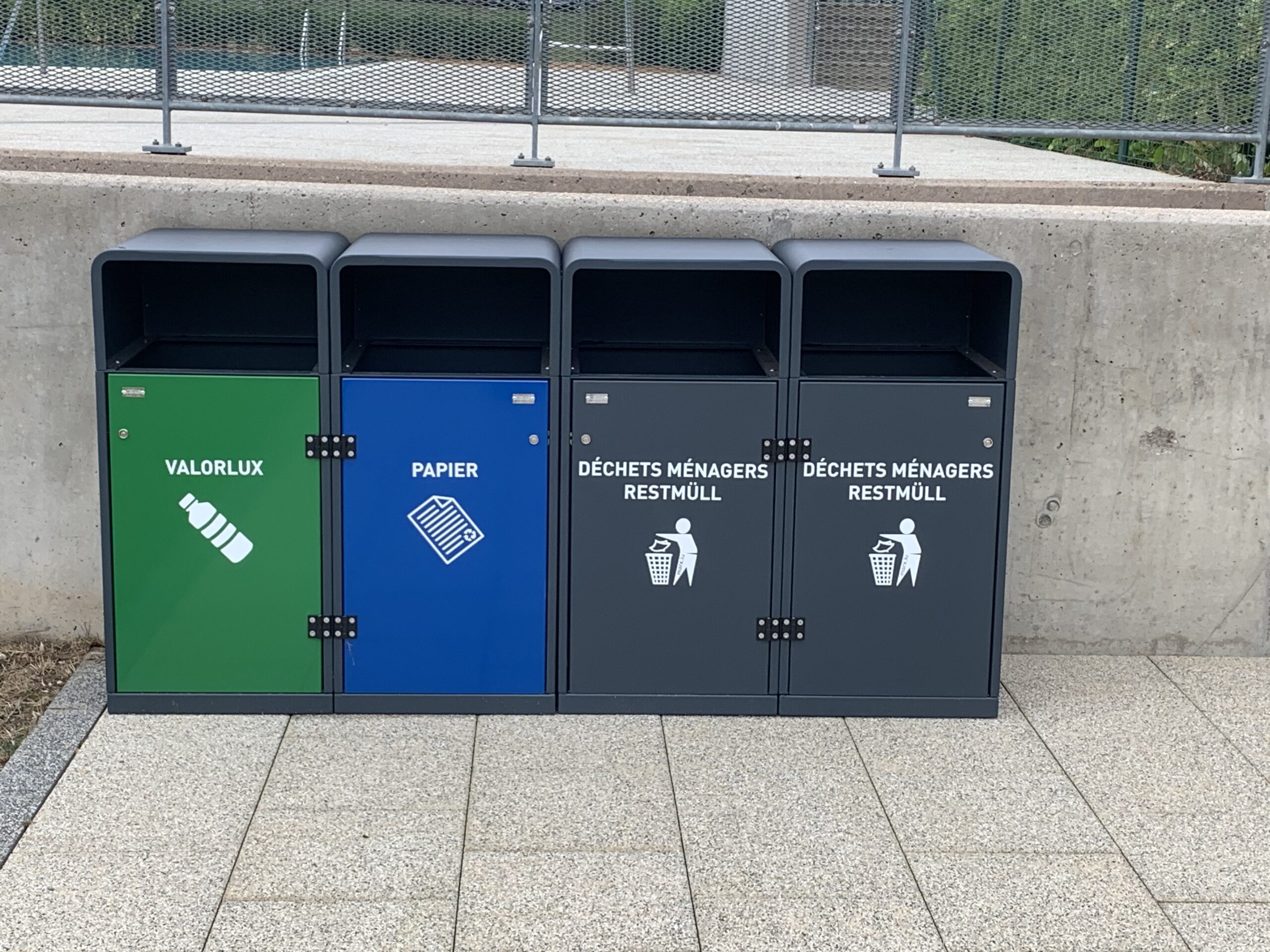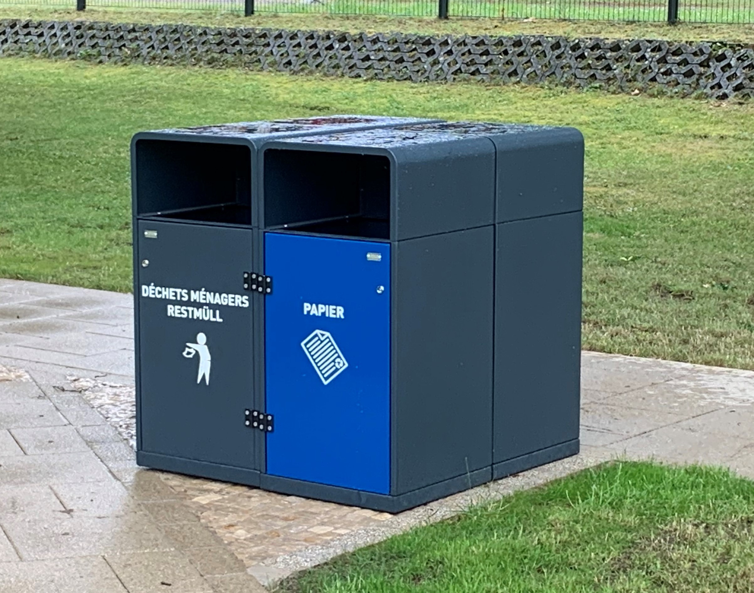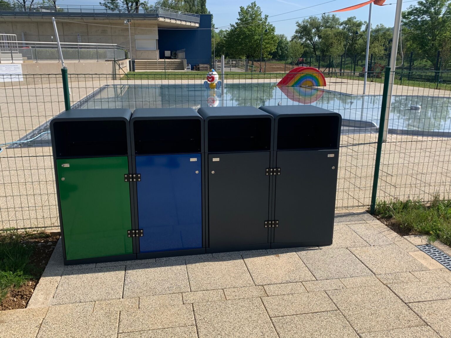 Buiten afvalbak Cubo Cestini. Hier in de lineaire opstelling. U kunt kiezen voor een 2-zijdige opening of aan 1 kant gesloten. Onbeperkt schakelbaar en diverse ral kleuren leevrbaar.