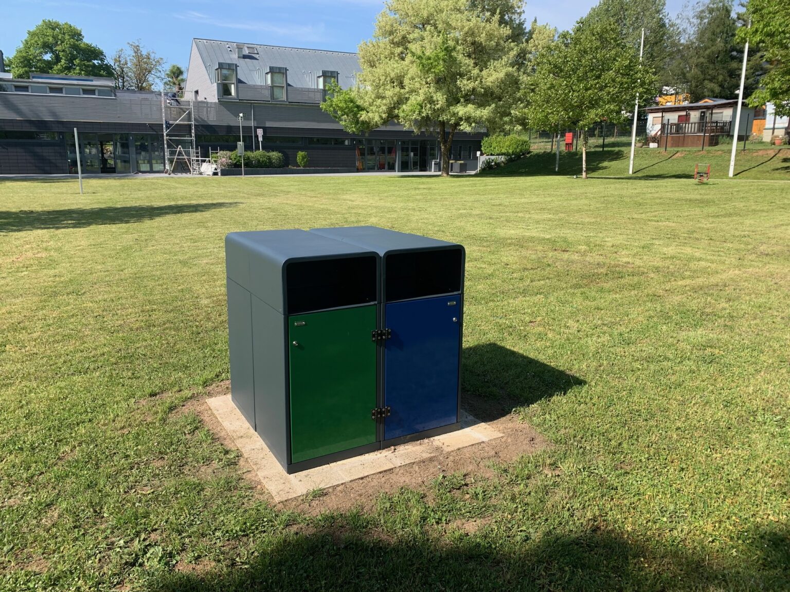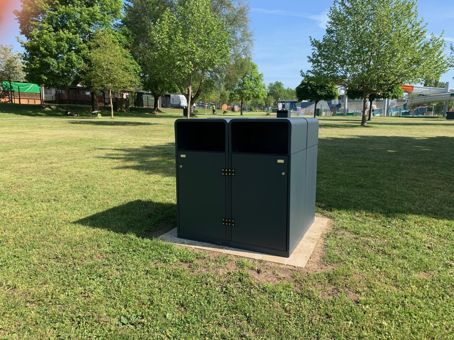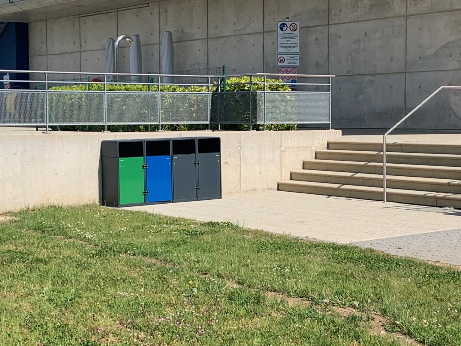 Buiten afvalbak Cubo Cestini. Hier in de lineaire opstelling. U kunt kiezen voor een 2-zijdige opening of aan 1 kant gesloten. Onbeperkt schakelbaar en diverse ral kleuren leevrbaar.