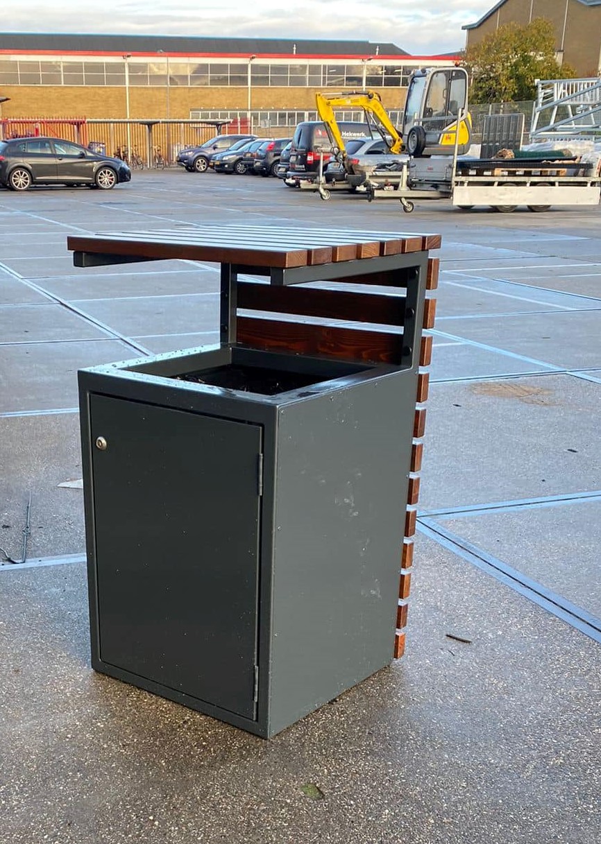 Elegante afvalbakken van naar keuze uitgevoerd in verzinkt staal, standaard gecoat ral 7016