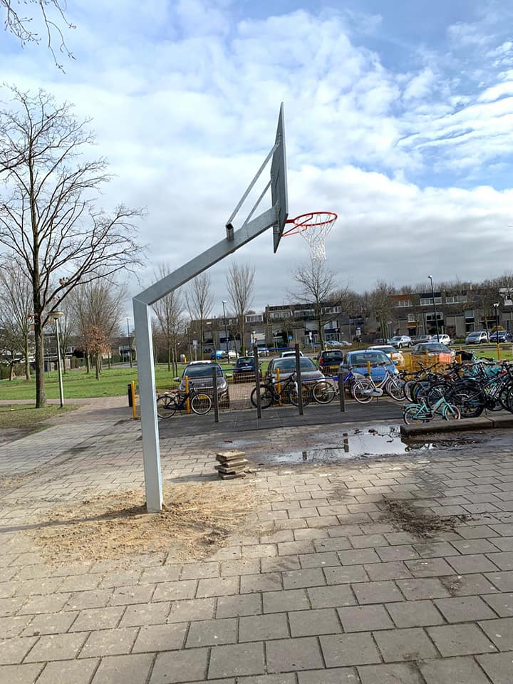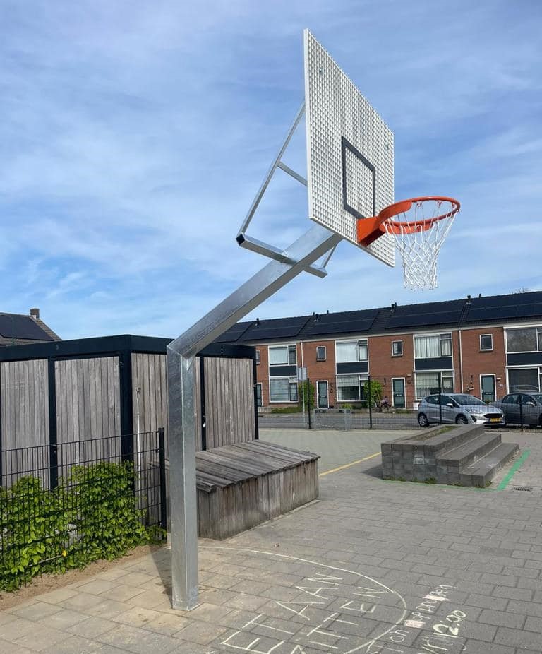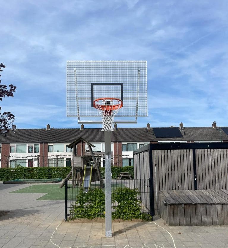Vandalisme bestendige basketbalpaal met geluidsarm antivandaal basketbalbord met wedstrijdformaat. Daardoor ideaal voor het officiële pleintjesbasketbal. (De nieuwe Olympische sport, waar Nederland in de wereldtop meedraait).