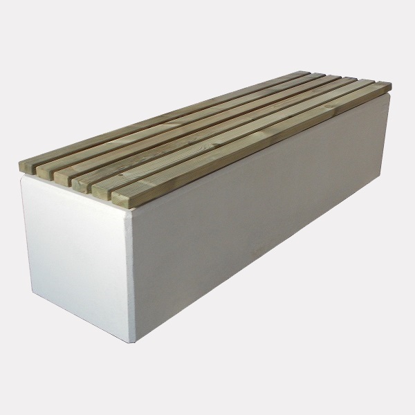 Monobloc-parkbank vervaardigd uit een gewapend mengsel met geribbeld staal, bestaande uit wit cement 525, wit marmergranulaat met zorgvuldig geselecteerde korrelgrootte, wit marmerpoeder en additieven voor verdichting en vloeibaarheid om het waterpercentage te verlagen. Het mengsel wordt in mallen gegoten en vervolgens onder hoge druk gezandstraald met kwartszand.