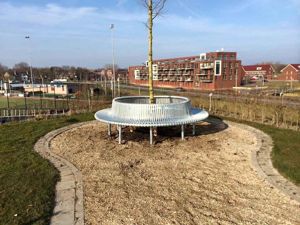 De ronde boombank model Ament zorgt voor een unieke en functionele zitplek in parken, tuinen en openbare ruimtes.