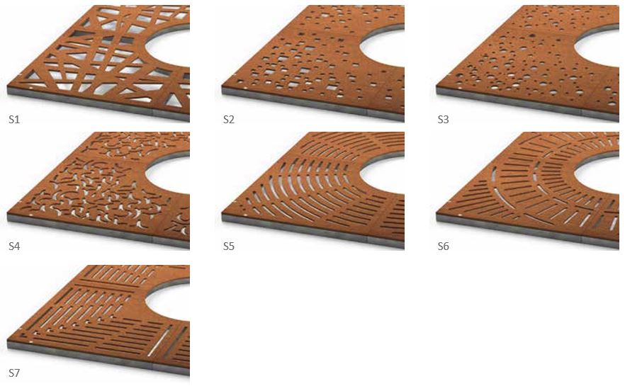 Boomrooster Corten, vierkant is leverbaar de volgende patronen. Patroon S1 tot S7. Klik op de afbeelding voor details: