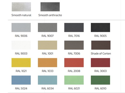 | RAL-kleuren frame | RAL 7016 (antracietgrijs) RAL 9005 (gitzwart) RAL 9006 (wit aluminium) RAL 9007 (grijs aluminium) RAL 9003 (wit) RAL 3003 (rood) RAL 6021 (groen) Corten (roestkleur) Andere RAL-kleuren op aanvraag |
