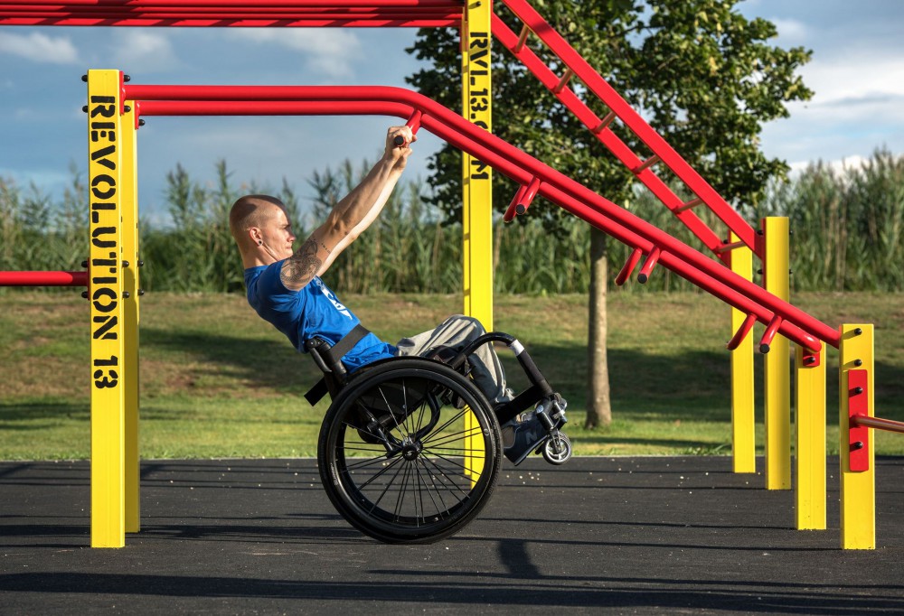 Calisthenicstoestel Monkey Dome. Een innovatief buiten fitnesstoestel dat speciaal is ontworpen om toegankelijk te zijn voor iedereen, inclusief rolstoelgebruikers.