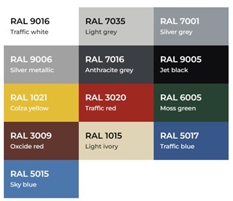 Leverbare RAL-kleuren met polyestercoating, zie afbeelding onder, de laatste.