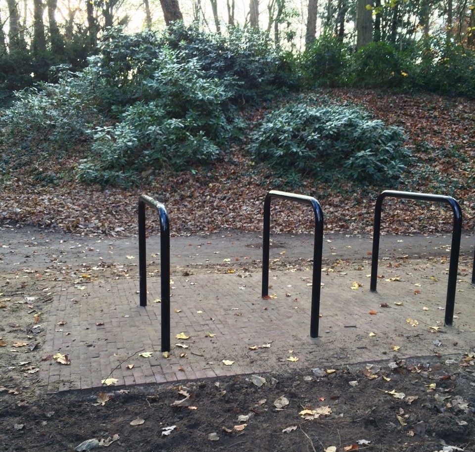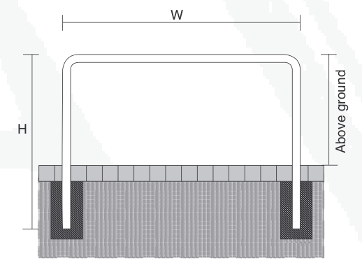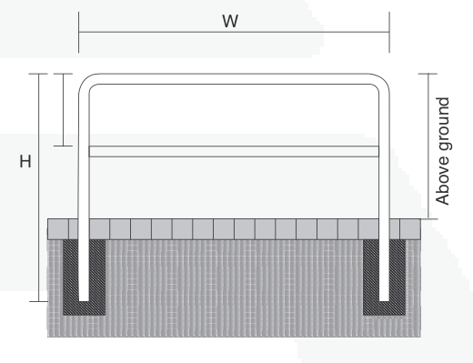 De plaatsing onderlinge advies-afstand: Eén meter tussen twee aanleunbeugels is de aanbevolen afstand. Een onderlinge afstand van 80 centimeter, van uw aanleunbeugels is de minimale adviesafstand. U kunt kiezen voor aanleunbeugels met voetplaat voor vastschroeven op het maaiveld of verlengde staanders om te inbetonneren.