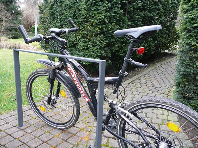 Deze fietsnietje, aanleunbeugels, zijn ook leverbaar met tussenbuis, zodat ook de kleinere fietsers hun fiets hier netjes tegen-aan kunnen parkeren.