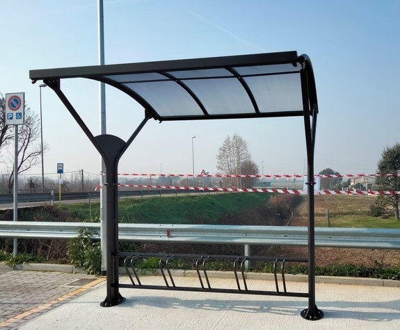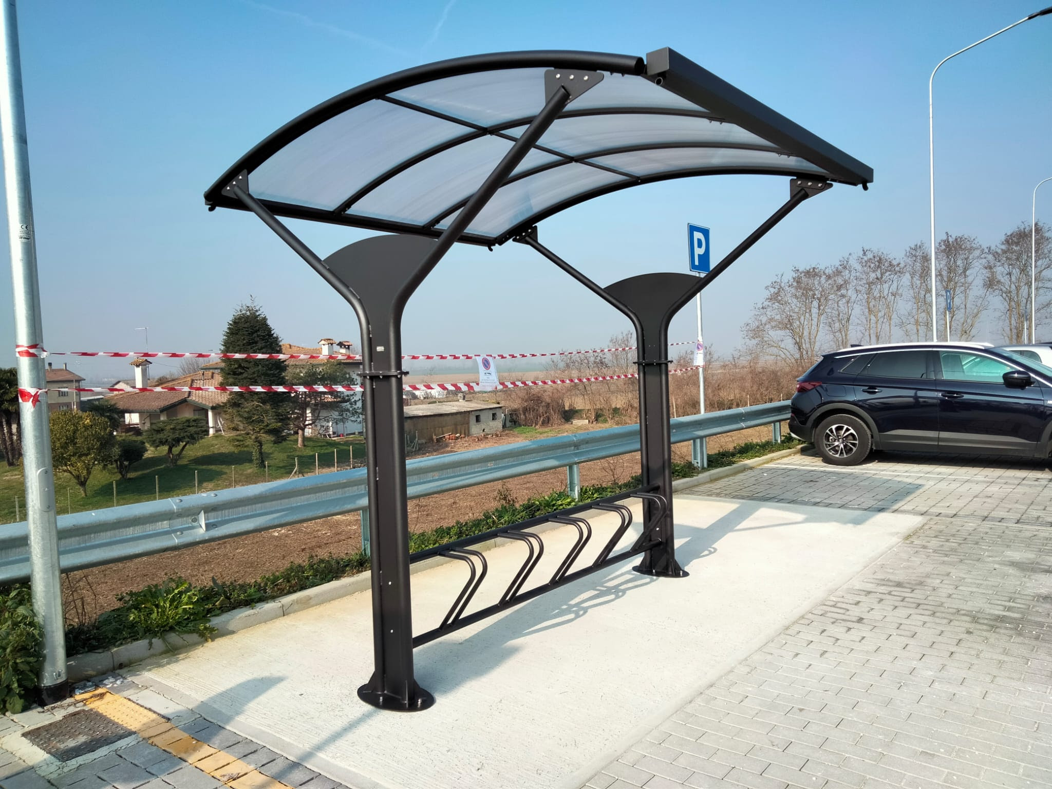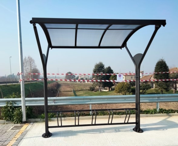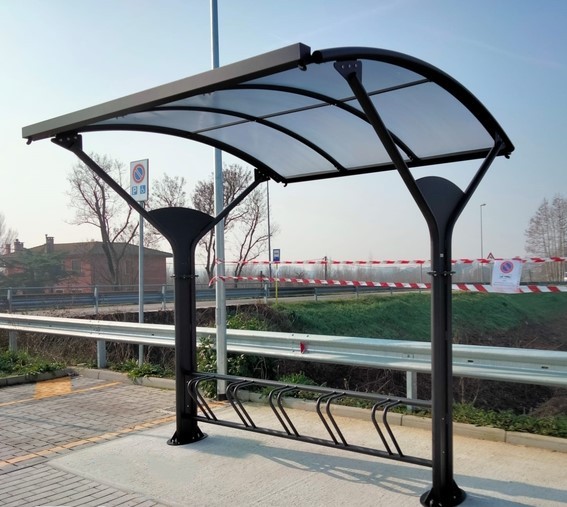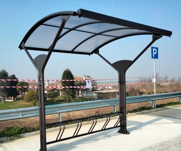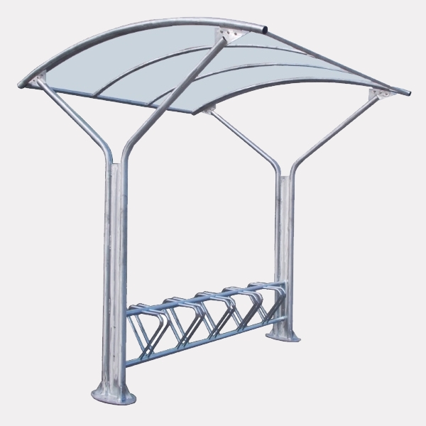 Voordelige fietsen overkapping, type terminal model Delta. Leverbaar met en zonder geïntegreerd fietsenrek. Verzinkt staal geleverd als eenvoudig te monteren bouwpakket.