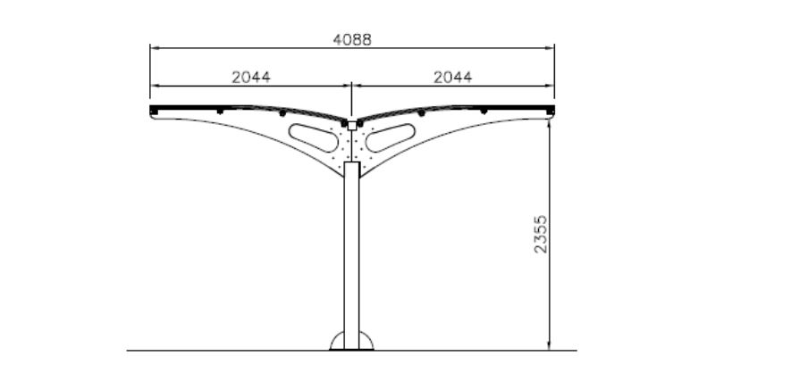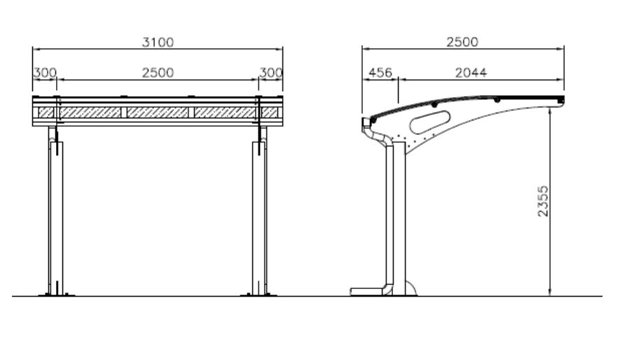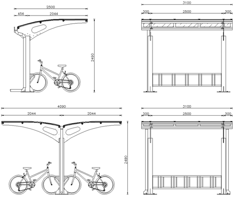 Basisdeel lengte is 3100mm, voor aanbouwdelen geldt L2500mm. Tussen de staanders van deze fietsoverkapping zit steeds 2500mm.