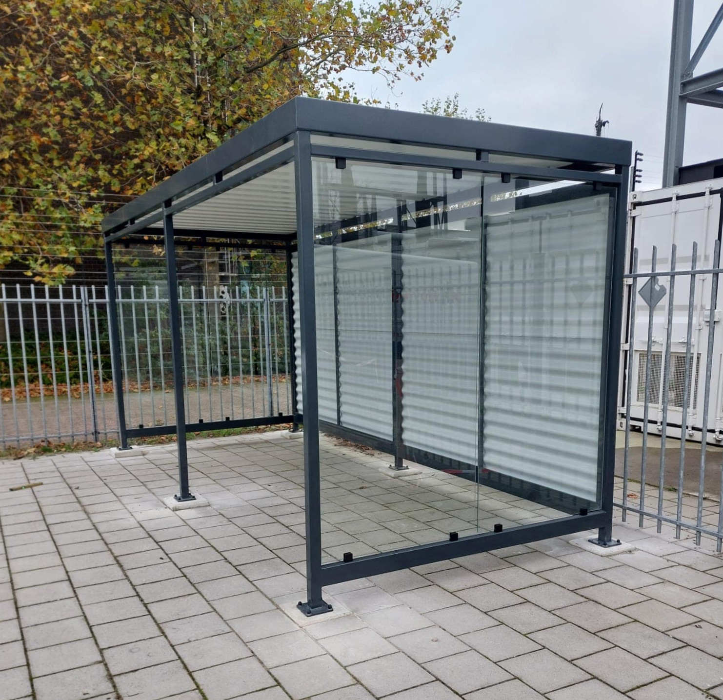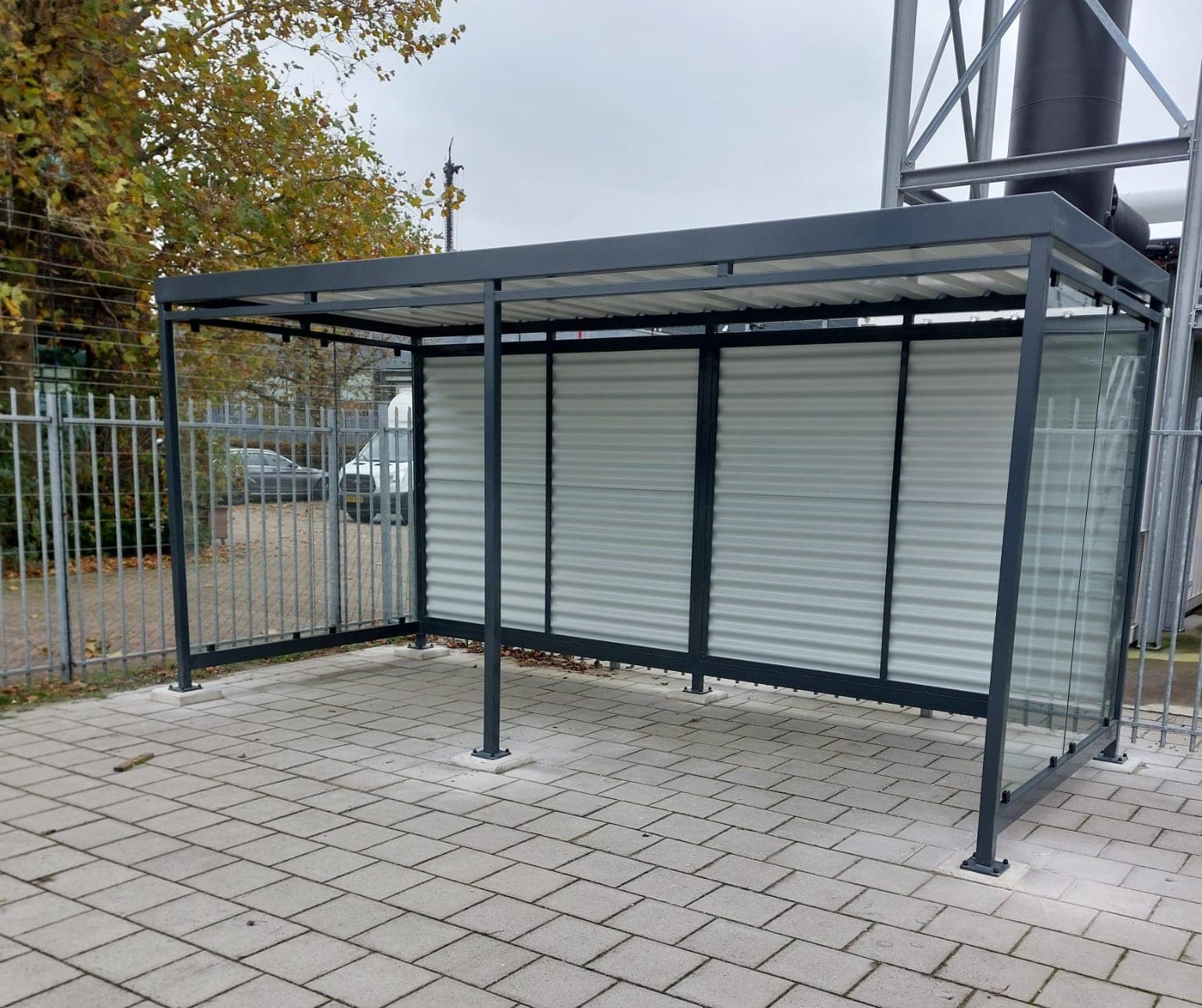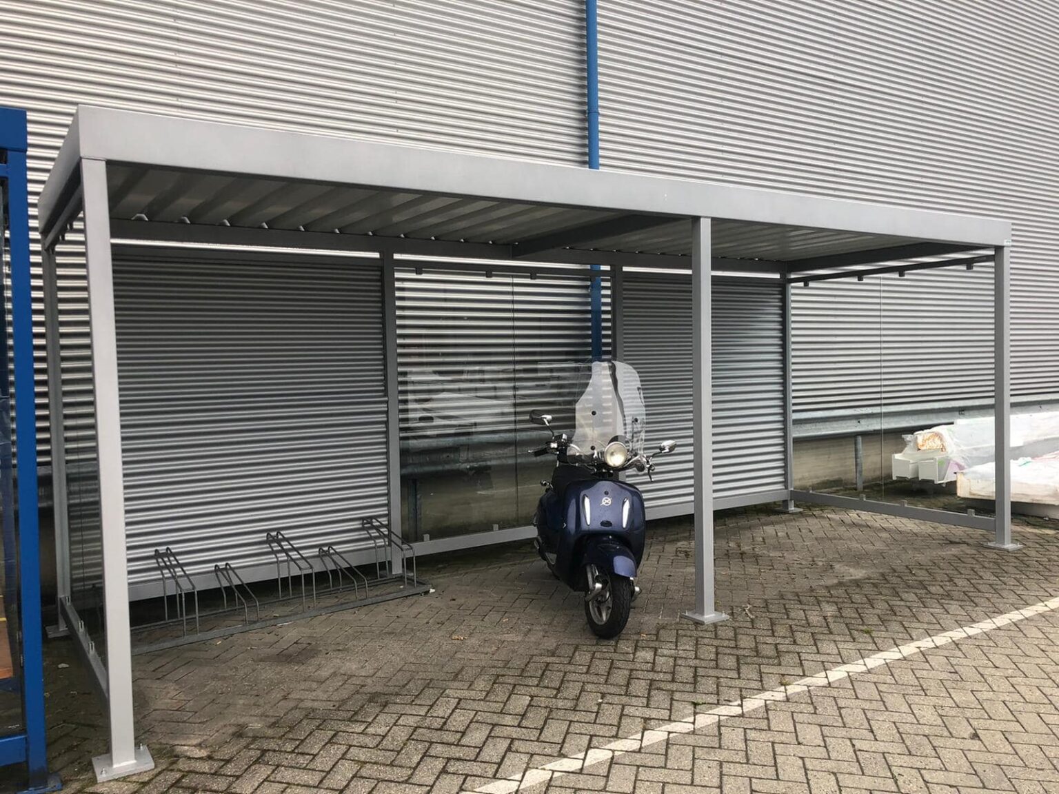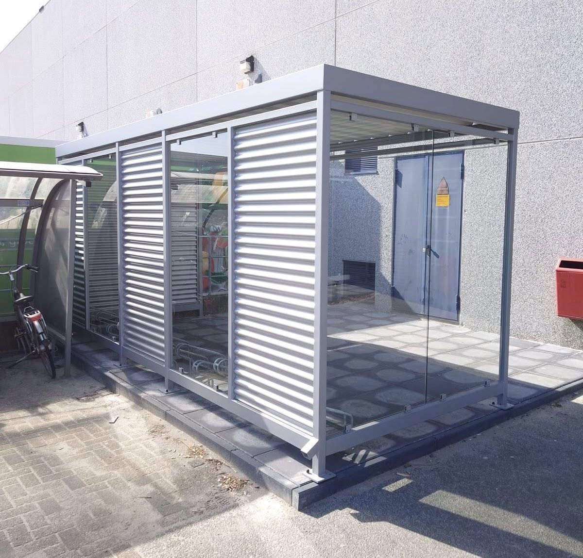Standaard uitgevoerd met gegolfd staalplaat in aluminiumkleur (RAL 9006) en helder ESG-veiligheidsglas, wat zorgt voor een elegante én duurzame afwerking. Ideaal voor bedrijven, instellingen en particulieren die een duurzame en onderhoudsarme fietsoverkapping willen kopen.