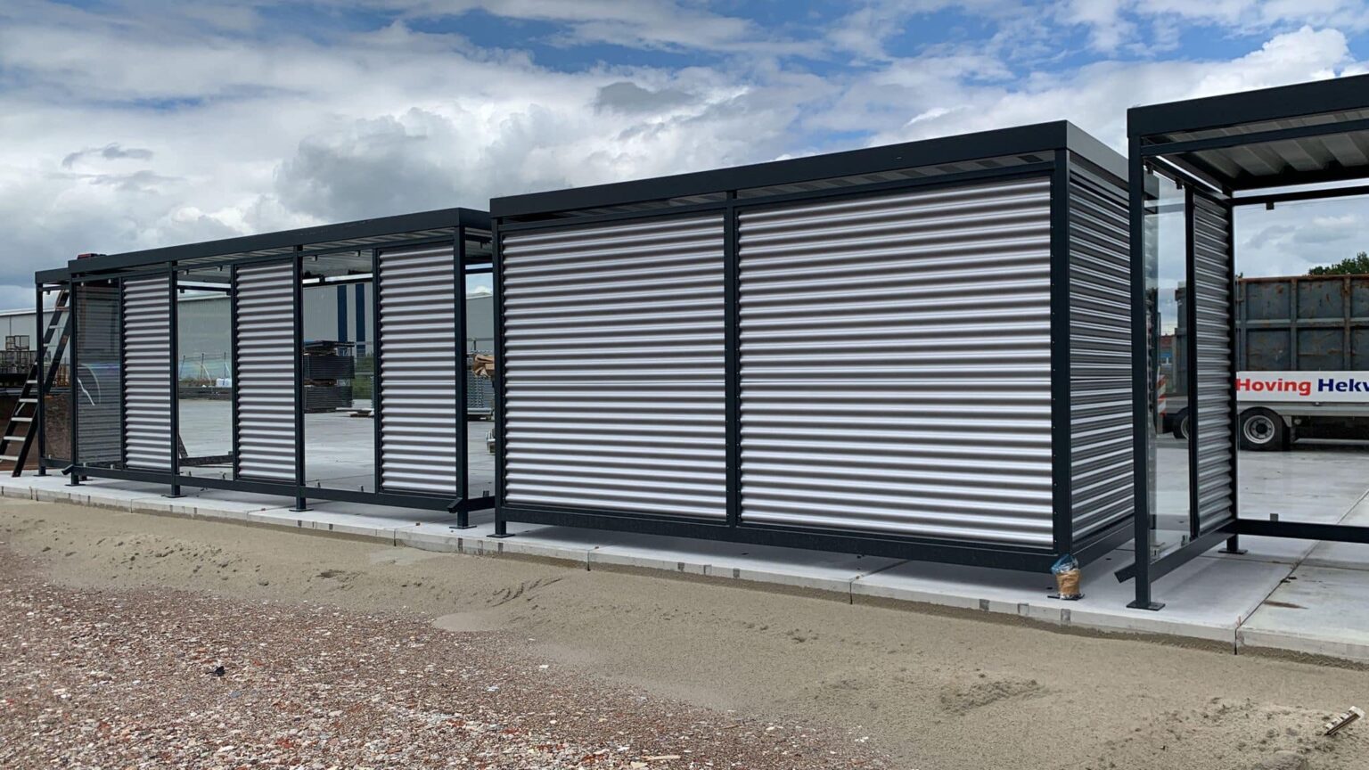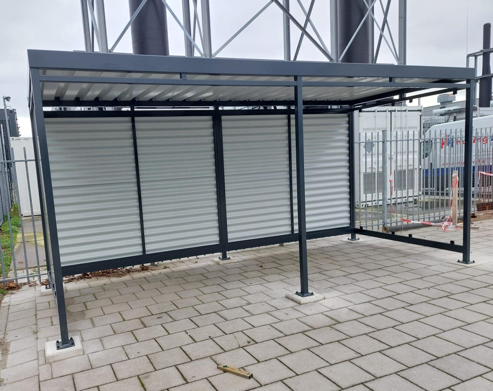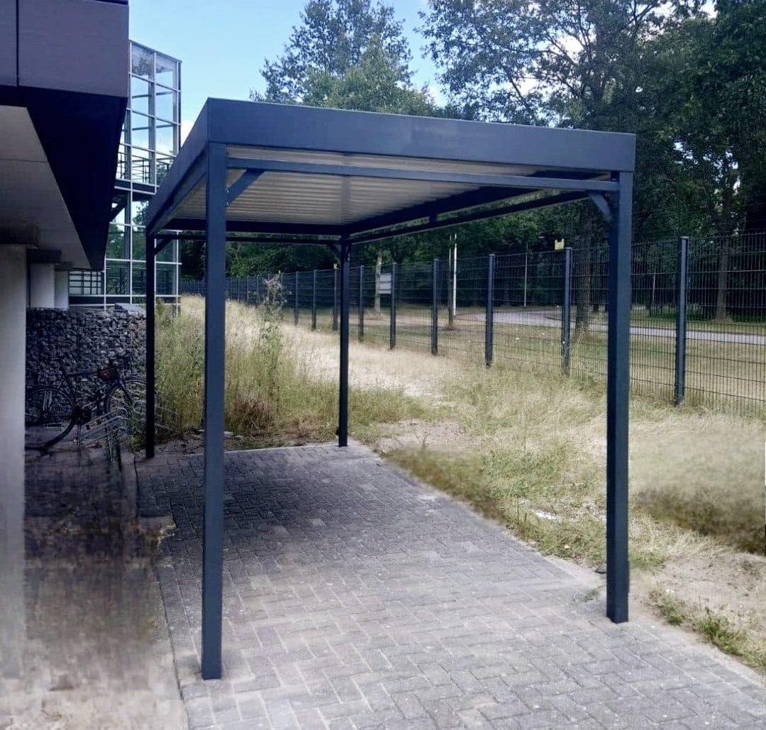 Staanders 60 x 60 mm, verzinkt en gepoedercoat. Dak van trapeziumplaat RAL 9002