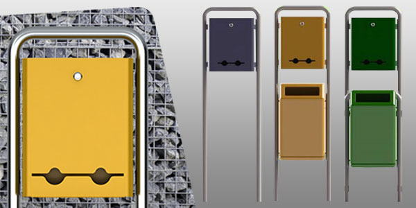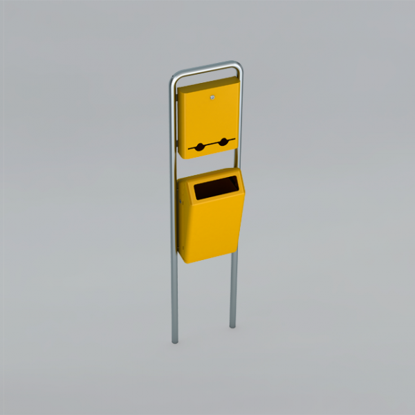 Een variant op de buiten Afvalbak Bima met een zakjes dispenser daarboven, speciaal voor in honden uitlaatzones. Alle gangbare hondenpoepzakjes passen in de dispenser.  Het kwalitatieve topsegment.