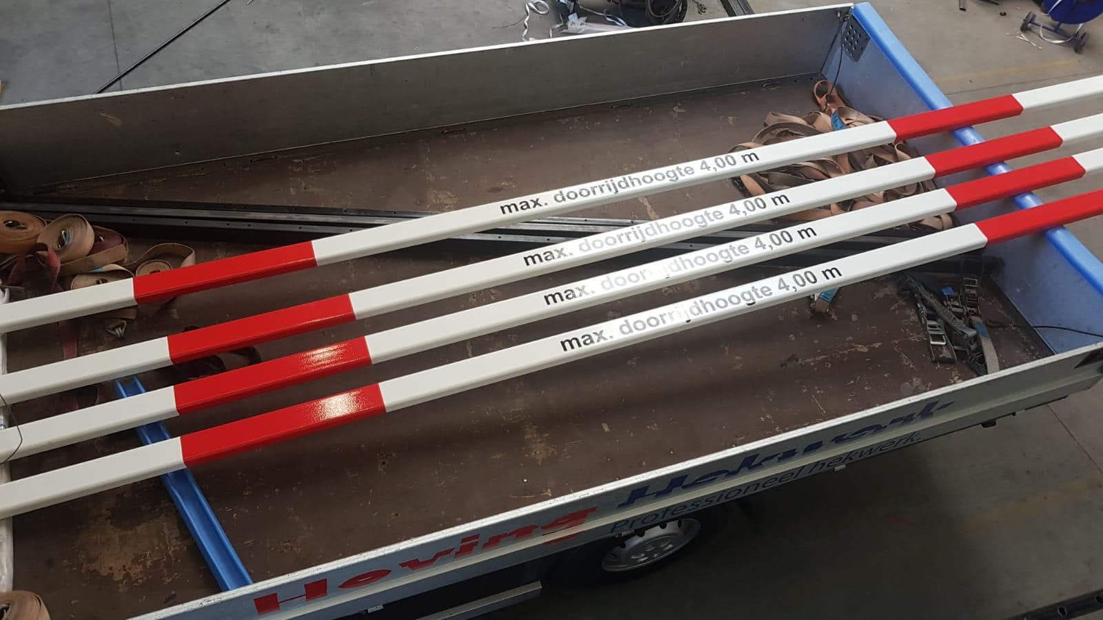 Uw hoogtebegrenzer laten voorzien van lichte aluminium aanrijdbalken, of zware stalen op maat gemaakt. Wit gecoat en voorzien van rode reflecterende strepen.