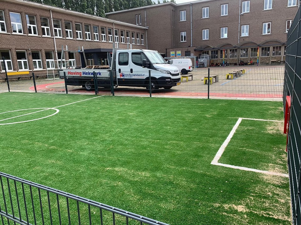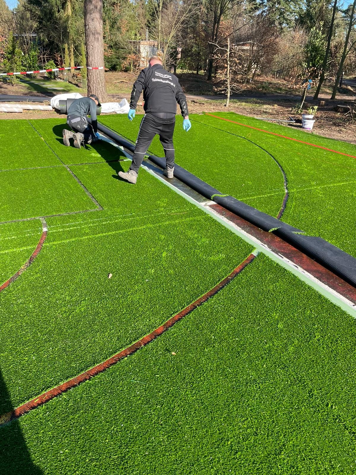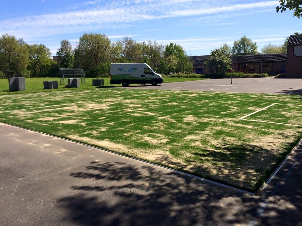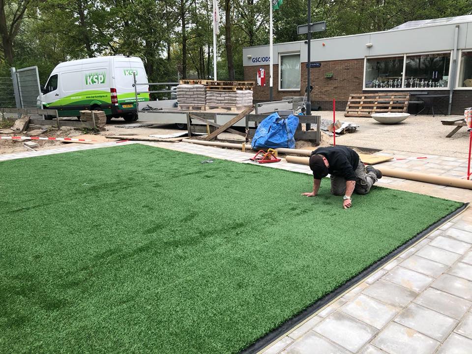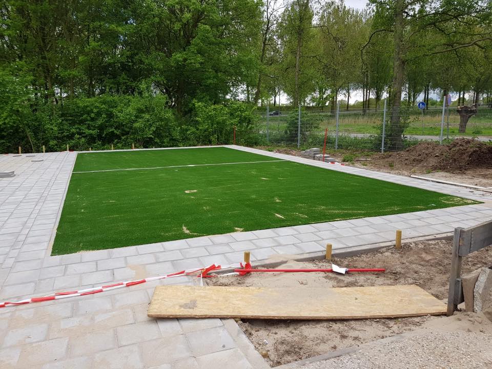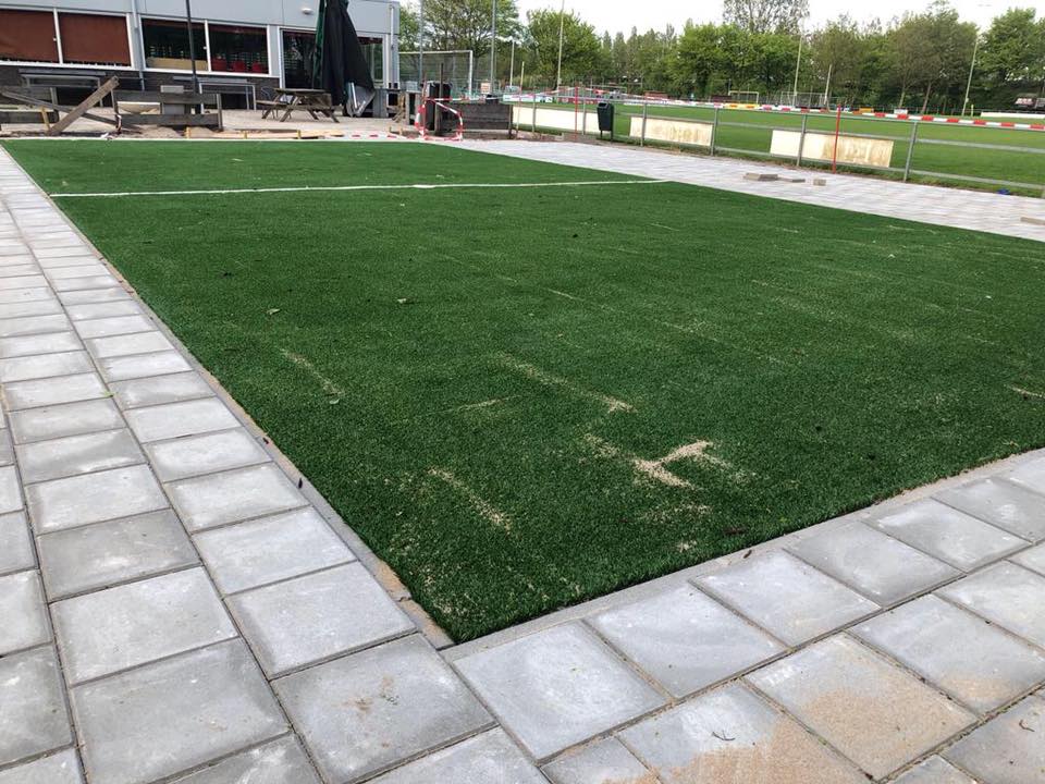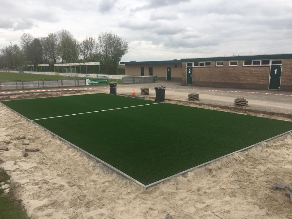 Ideaal voor pannavelden en sportkooien, de vereniging zorgt voor een zwarte ondergrond, zaait gras in en legt de mat erop.