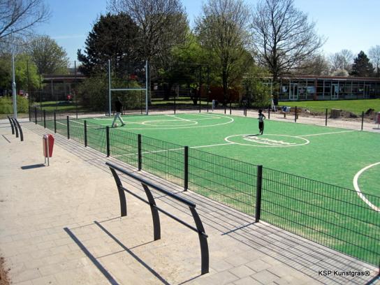 *Hier gelegd op asfalt, LSR24mm kunstgras, zandgevuld multiplay, door de dunne foam-laag is deze geschikt voor tennis, basketbal, hockey en voetbal. De randafwerking is de metalen-strip