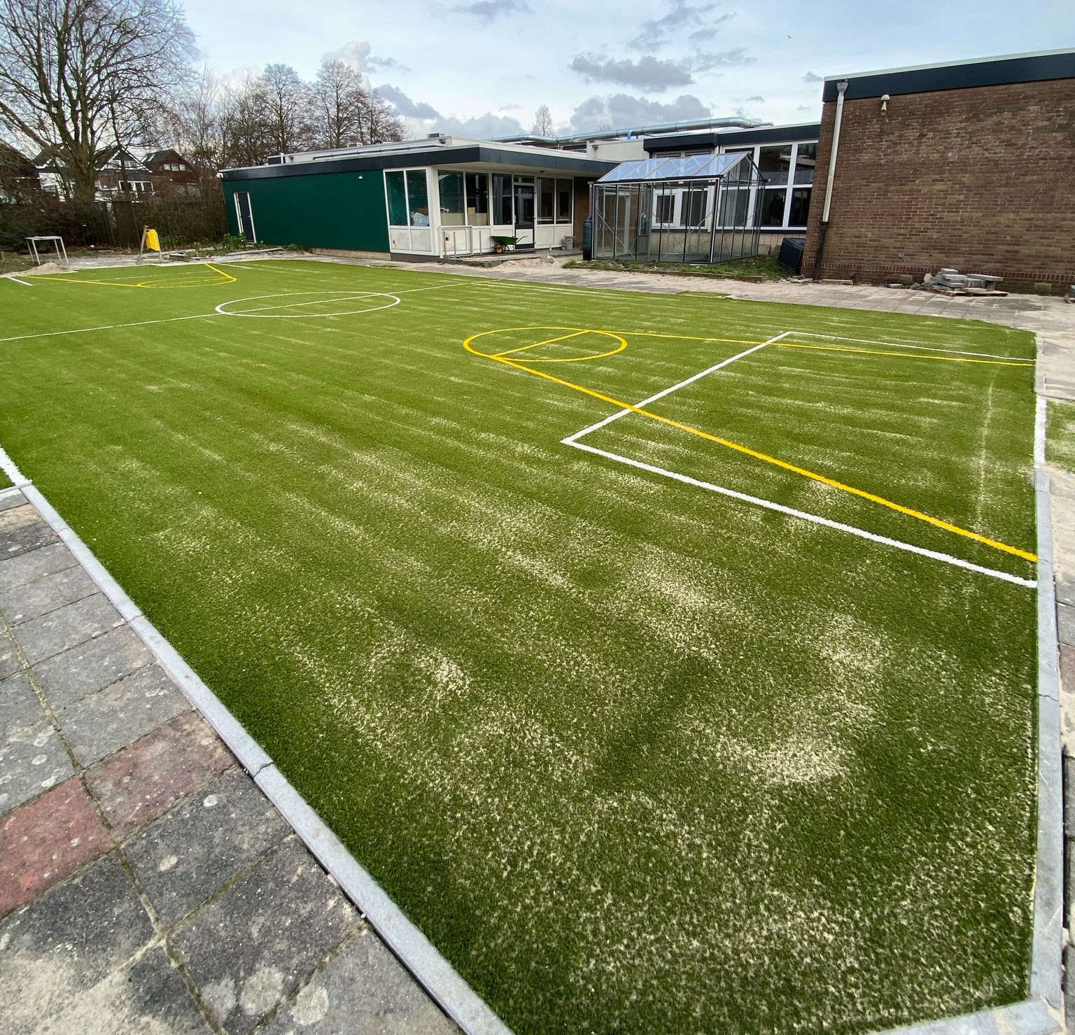 Een speelvloer van een kunstgrasmat, gecombineerd met gras. Hierdoor ontstaat er een zeer duurzame speelvloer.