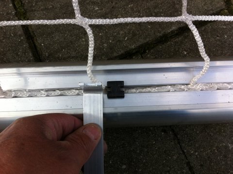 Bevestigen is eenvoudig: plaats het netkoord in de glijgoot, draai de haak een kwartslag, en het net zit stevig vast.