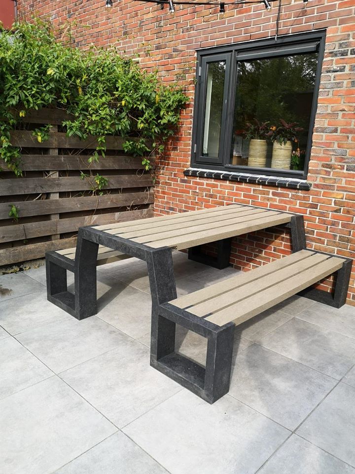 Complete kunststof picknicktafel en banken, een set uit 1 stuk.