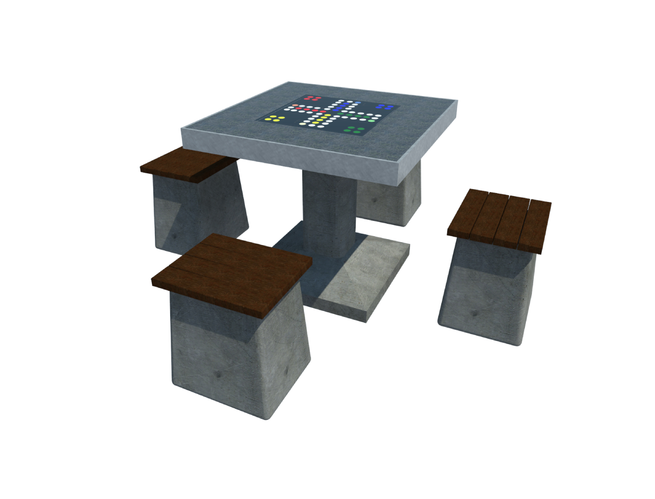 De Mens erger je niet en schaakvelden zijn gemaakt van een granieten plaat, ingebed in het tafelblad. De stoelen zijn gemaakt van beton met kunststof zitvlak, bruin van kleur.