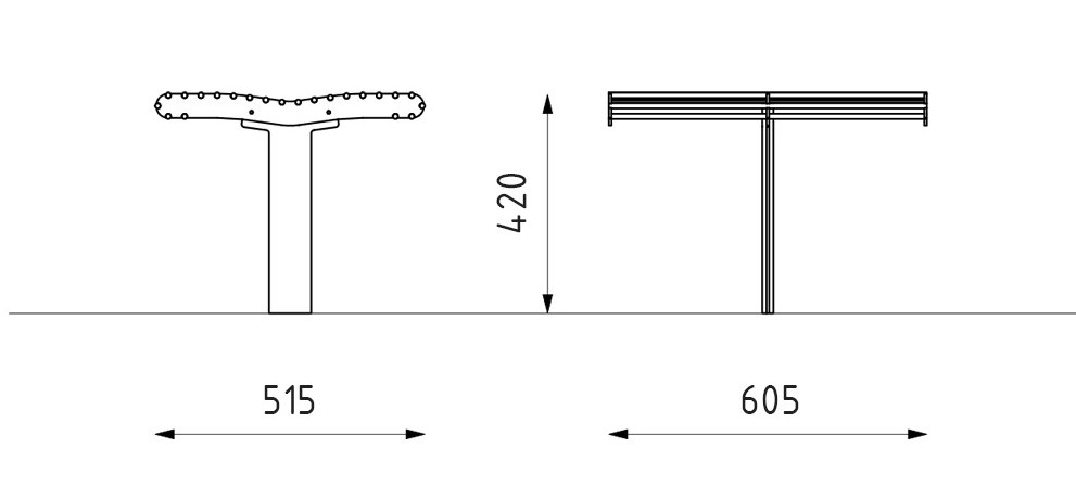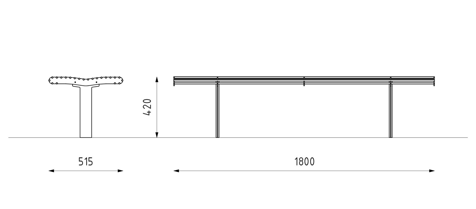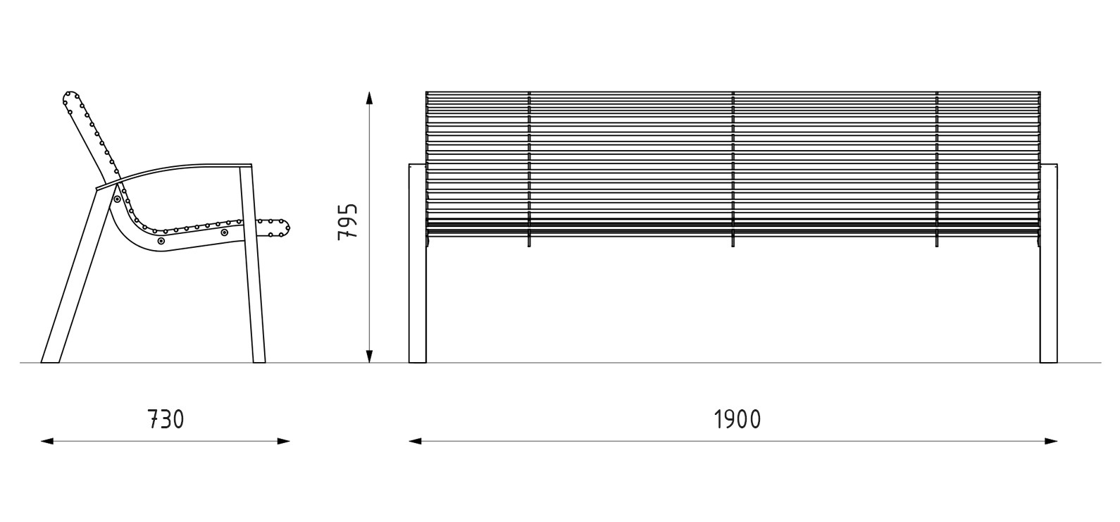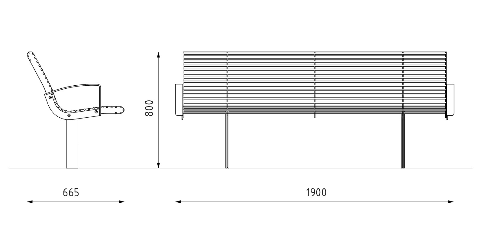 Deze bank bestaat uit 2 aan elkaar gelaste gebogen staalplaten. (60/10) En de zitting is voorzien van 2 hout-kunststof composiet latten: 1.655 x 140 x 22mm >
