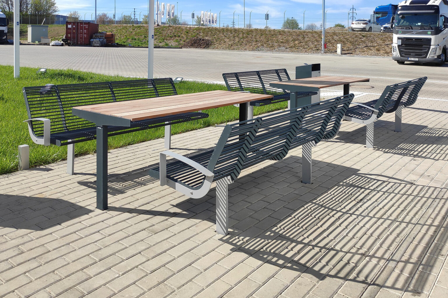 Ook in een gebogen uitvoering leverbaar. Naar keuze als naar bennen gebogen parkbank en in een naar buiten gebogen uitvoering.
