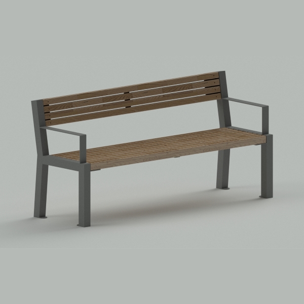 Parkbank met rug- en armleuning. Een verzinkt stalen frame afgewerkt met duurzame grenen houten latten voor de zitting en rugleuning. Ook verkrijgbaar in fsc hardhout. Elegant Italiaans straatmeubilair. Verrassend scherp geprijsd en bijzonder duurzaam.