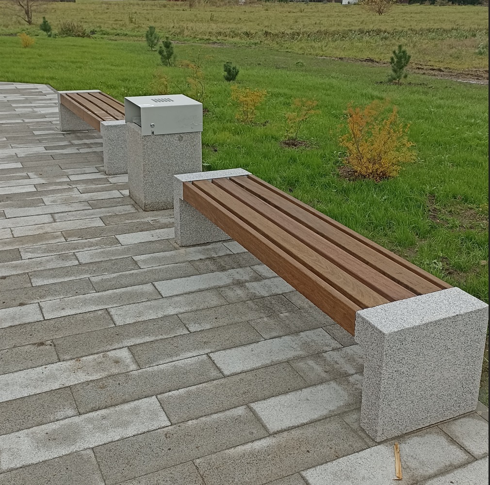 De zijsteunen zijn gemaakt van massief architectonisch beton. Het zitvlak en de rugleuning zijn vervaardigd van massief hout en bevestigd aan de gegalvaniseerde metalen fitting met verborgen roestvrijstalen schroeven. De metalen fitting is met stevige metrische schroeven verbonden aan de zijsteunen. Op de onderzijde van de steunen bevinden zich gegalvaniseerde stalen platen met gaten voor het verankeren van de bank aan de ondergrond.