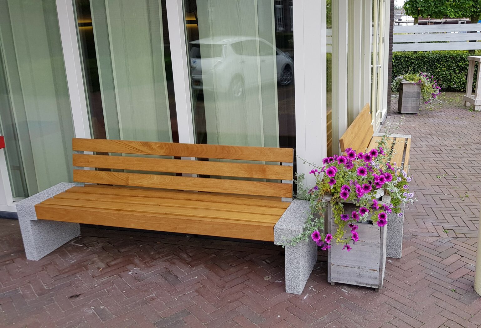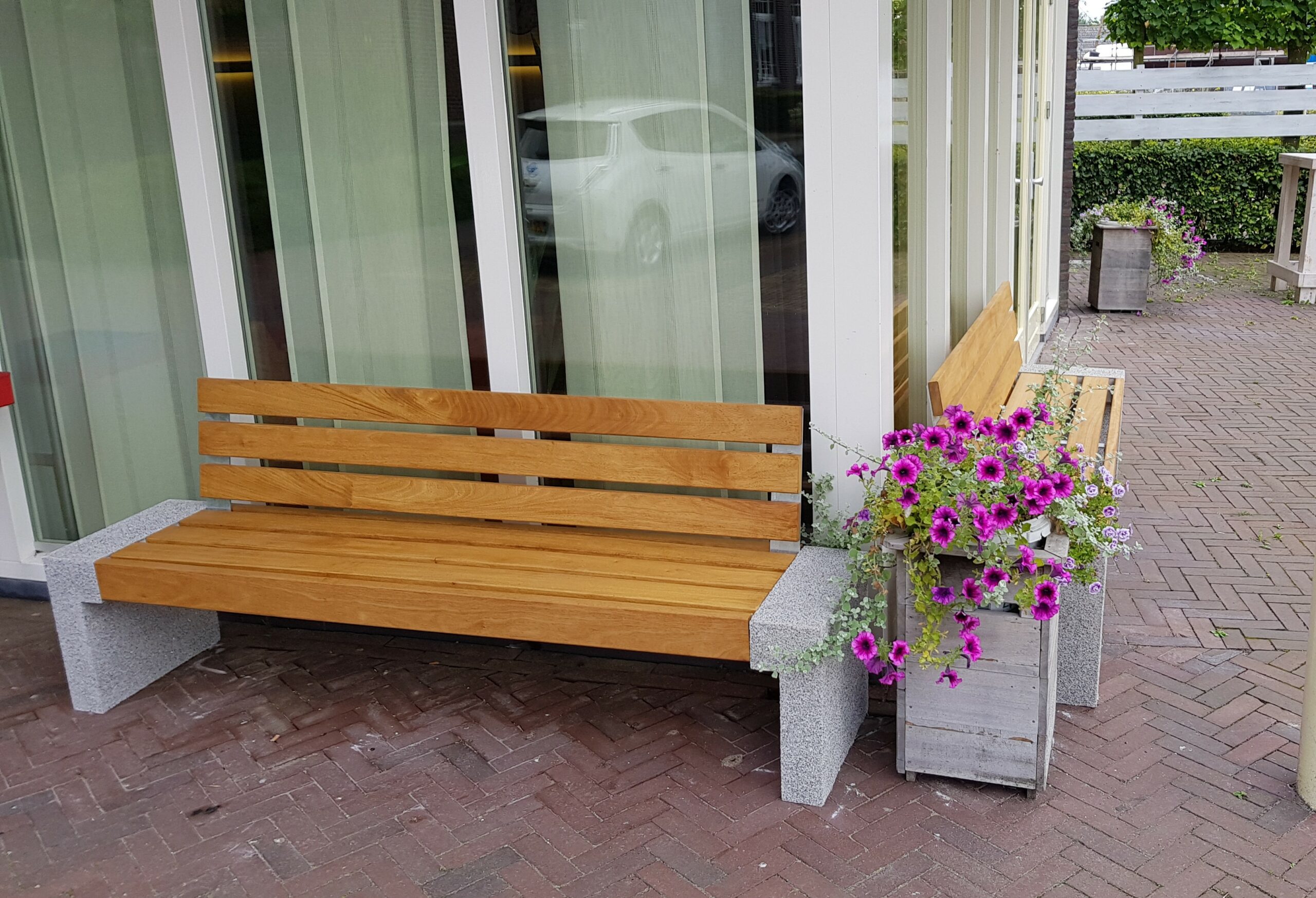Fraaie betonnen zijsteunen en leverbaar met zitleuning en zonder rugleuning. Voor de afwerking van het FSC hardhout heeft u de keuze uit verschillende oliën.