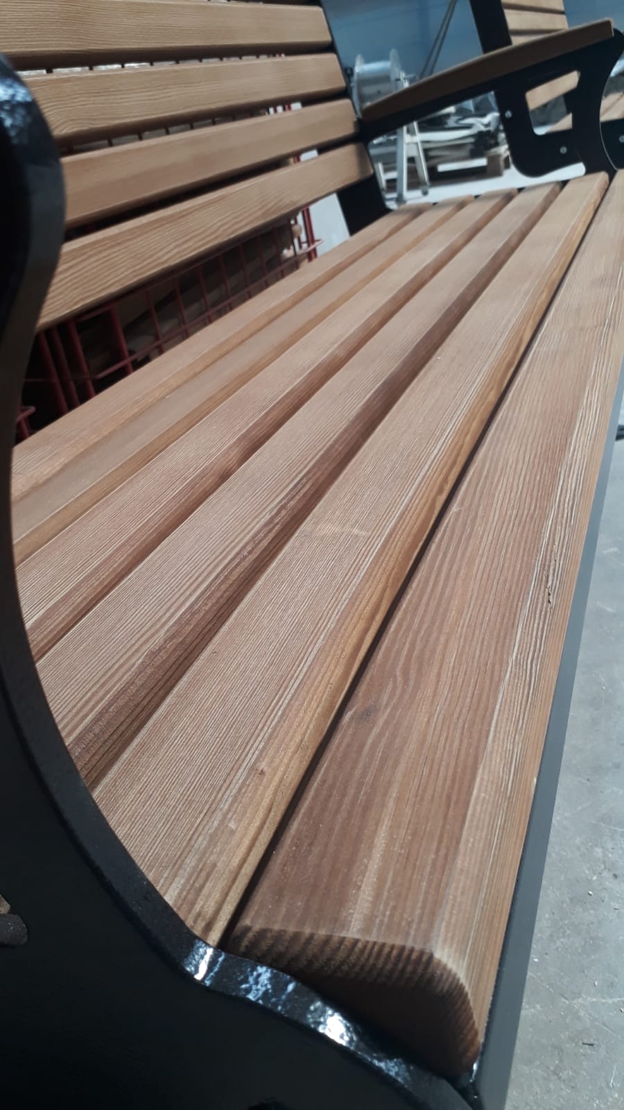 • Hout- staal combinatie - Lasergesneden plaatstaal leuningen en gedeeltes van het zitvlak met poedercoating en geïmpregneerde grenen latten