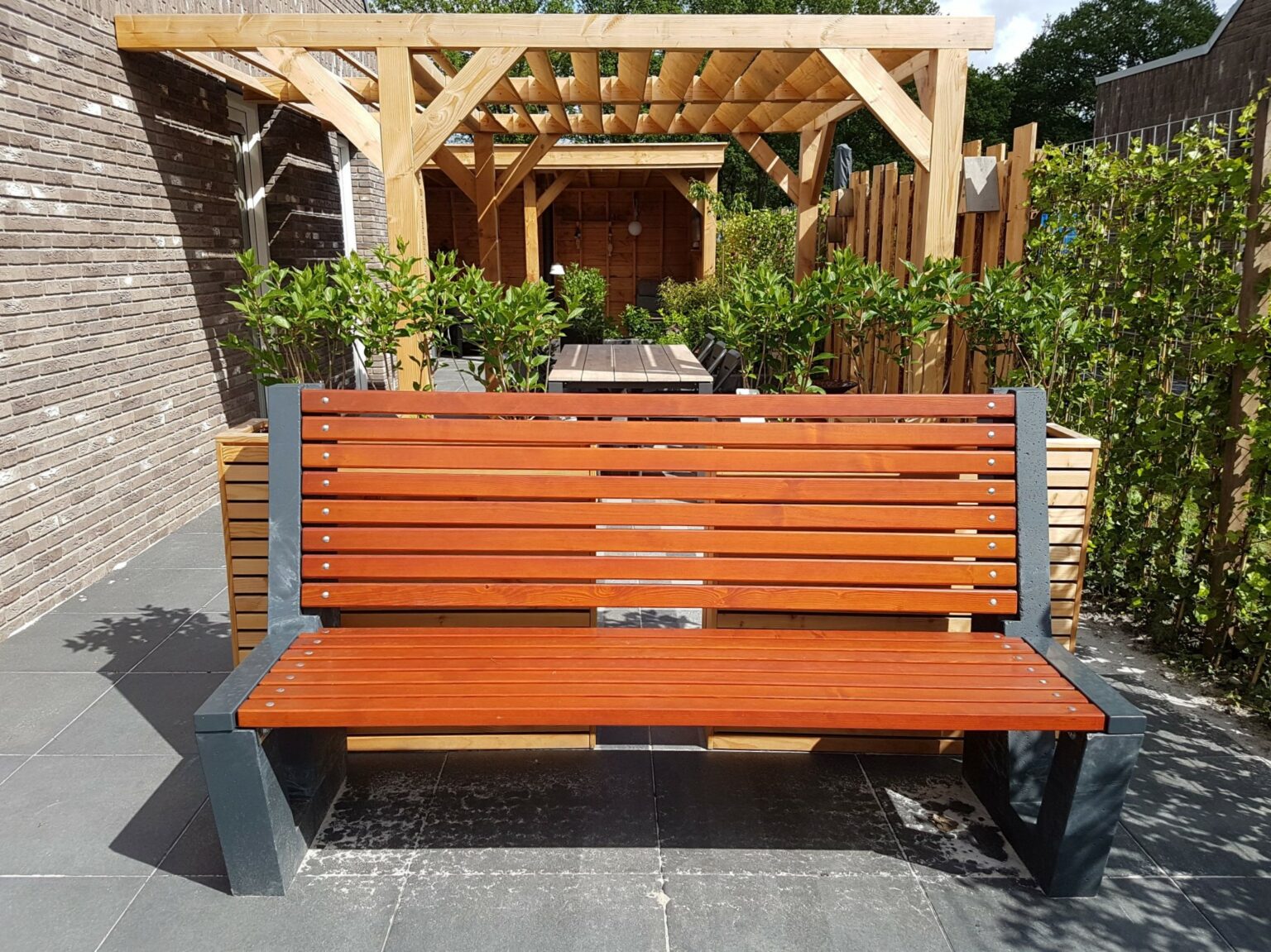 Fraaie betonnen zijsteunen en (optioneel) houten rugleuning. Voor de afwerking van het FSC hardhout heeft u de keuze uit verschillende oliën.