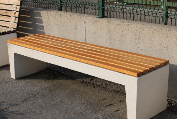 Betonnen parkbanken met een strak ontwerp. Betonnen banksteunen, optioneel afwerkt met poedercoating en houten latten. Met of zonder leuning. Lengte van 198 cm.