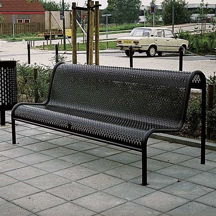 Fraaie stads- parkbanken. Model station. Een eenvoudige elegant vormgegeven parkbank met een uitstekend zitcomfort. Onderhouds- en vandalisme-arme straatmeubilair.