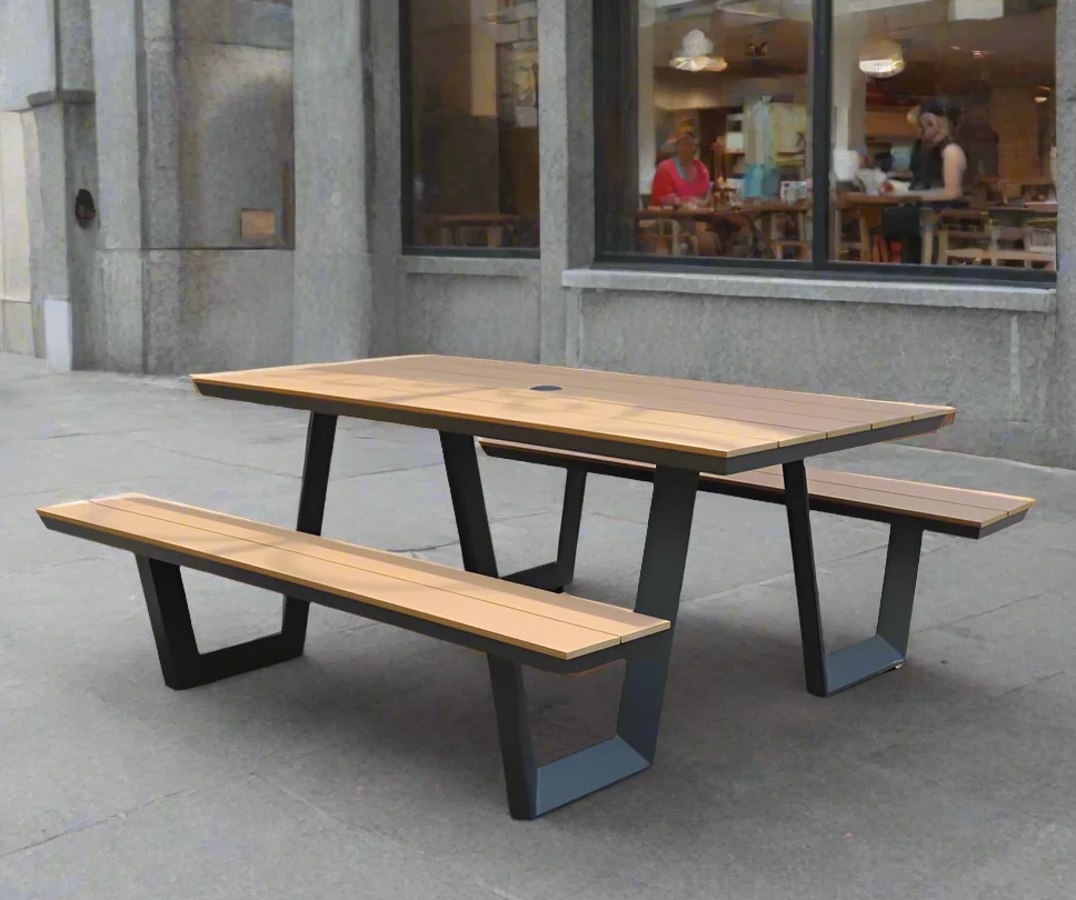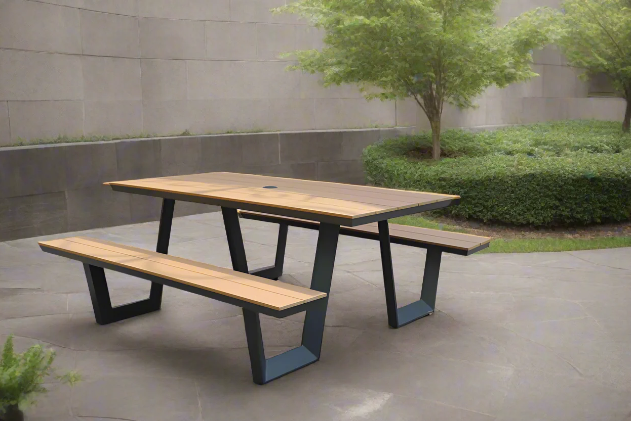 Deze onderhoudsarme picknickset is ideaal voor parken, bedrijfsterreinen en andere buitenruimtes. Dankzij de hoogwaardige materialen en het moderne design blijft de set jarenlang in topconditie en biedt het een comfortabele plek om te ontspannen.
