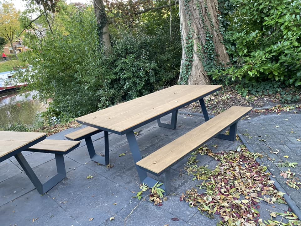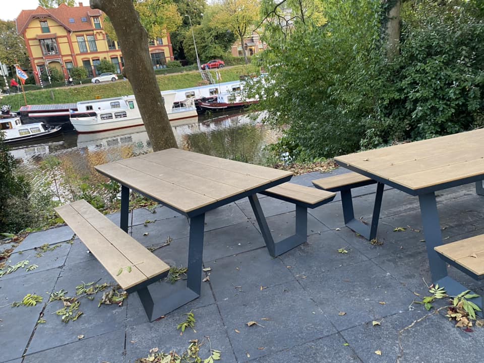 Door het blad en de zitting van composiet, zijn deze picknicktafels ideaal om onder bomen te zetten. Geen hechting van groene aanslag