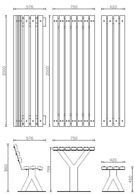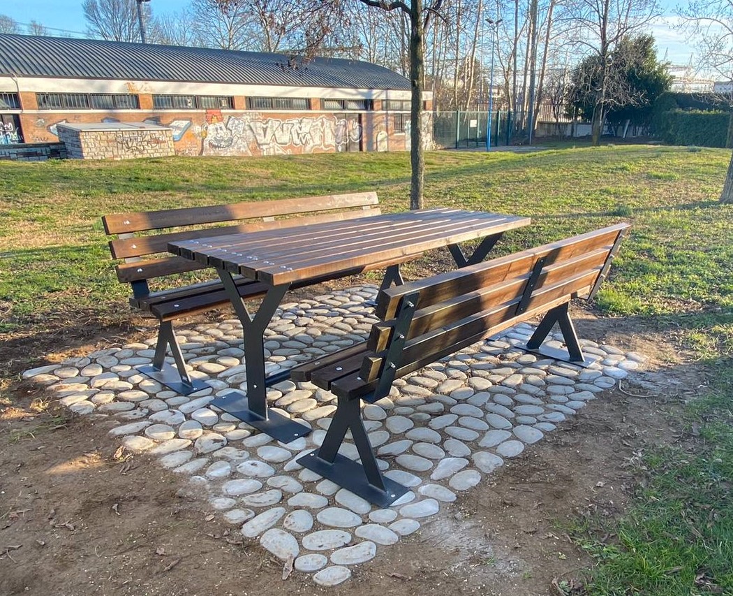 De banken en tafel zijn voorzien van voetplaten ten behoeve van een eenvoudige montage op het maaiveld.