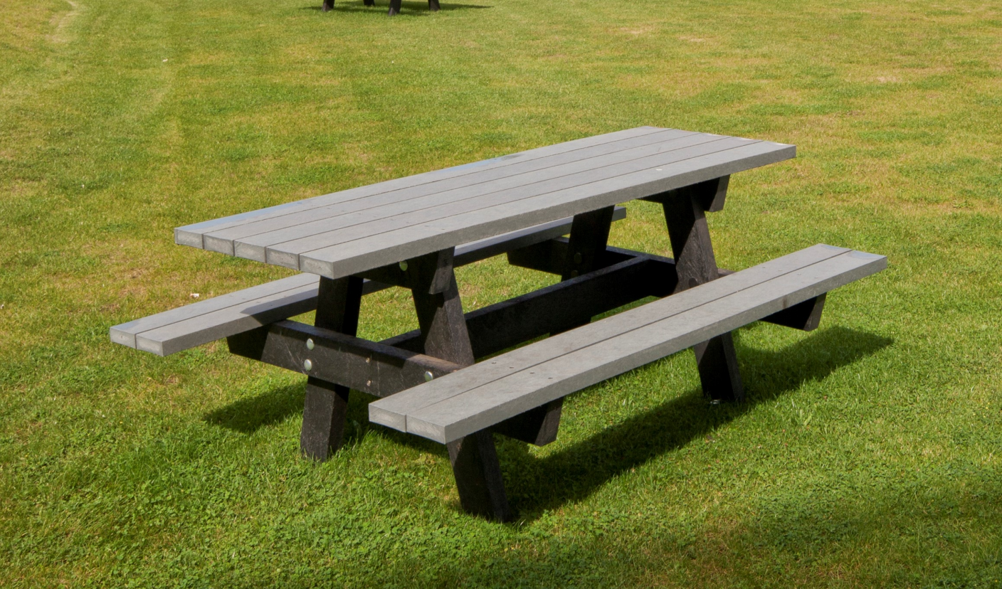 Picknicksets met extra breed blad. De royale uitvoering van deze massieve picknickset voor de openbare en semi-openbare ruimte. Afgebeeld in een fraaie bi-color uitvoering.
