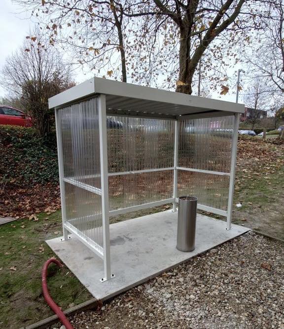 Rokersoverkapping – rookhok kopen? Model Hagen met geperforeerde staalplaat. Luxe en elegante rookoverkappingen.