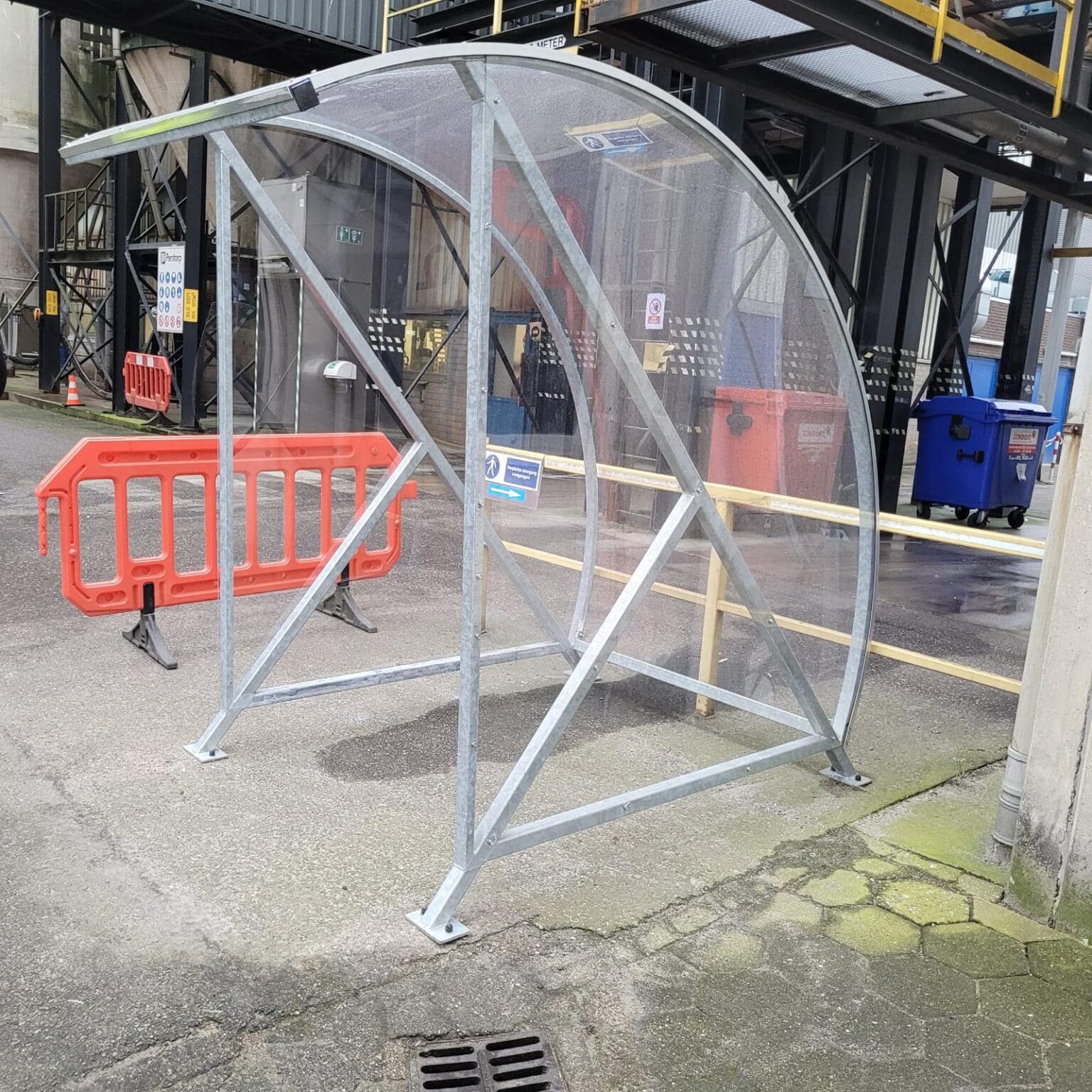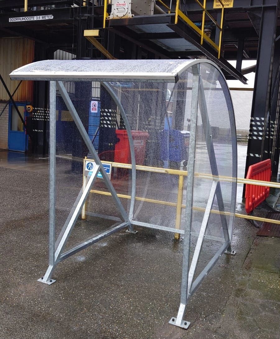 Kleine rookabri, rookoverkapping model BF600. In 2 afmetingen leverbaar L2m en L1.5m. Naar keuze verzinkt of in RAL 7016. Inclusief zelfdovende asbak van rvs 2.4L aan staander gemonteerd.