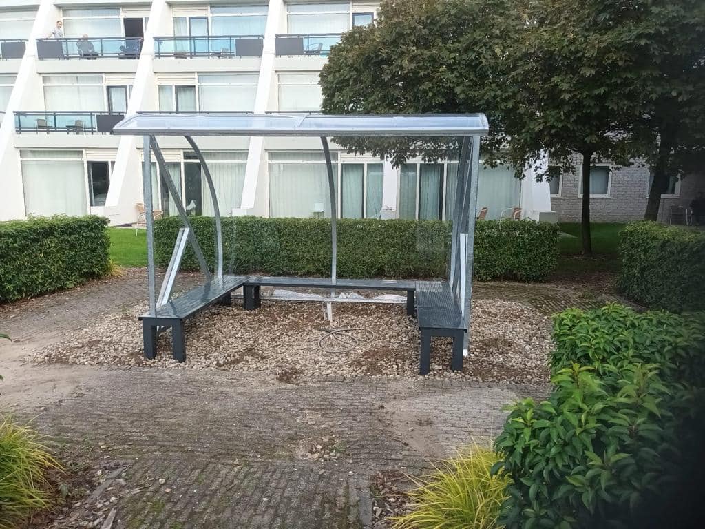 Deze duurzame rookruimte wordt geprefabriceerd geleverd, eenvoudig te plaatsen en ideaal als rookruimte, wachtruimte of overkapping voor betaalautomaten en ticketautomaten.