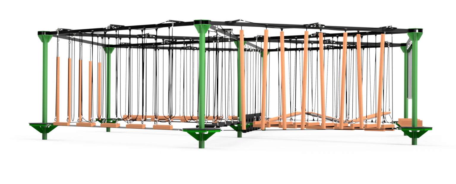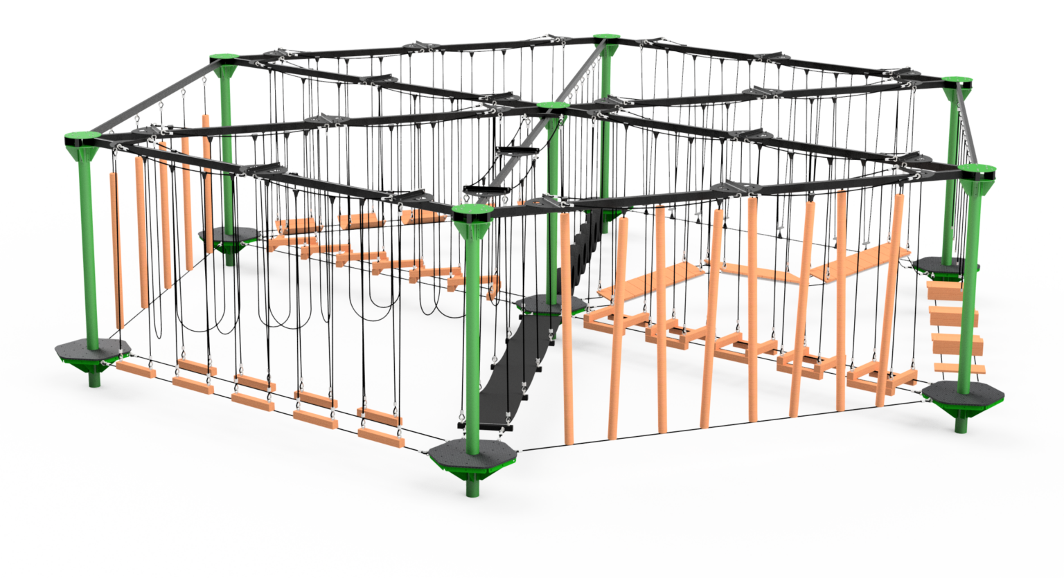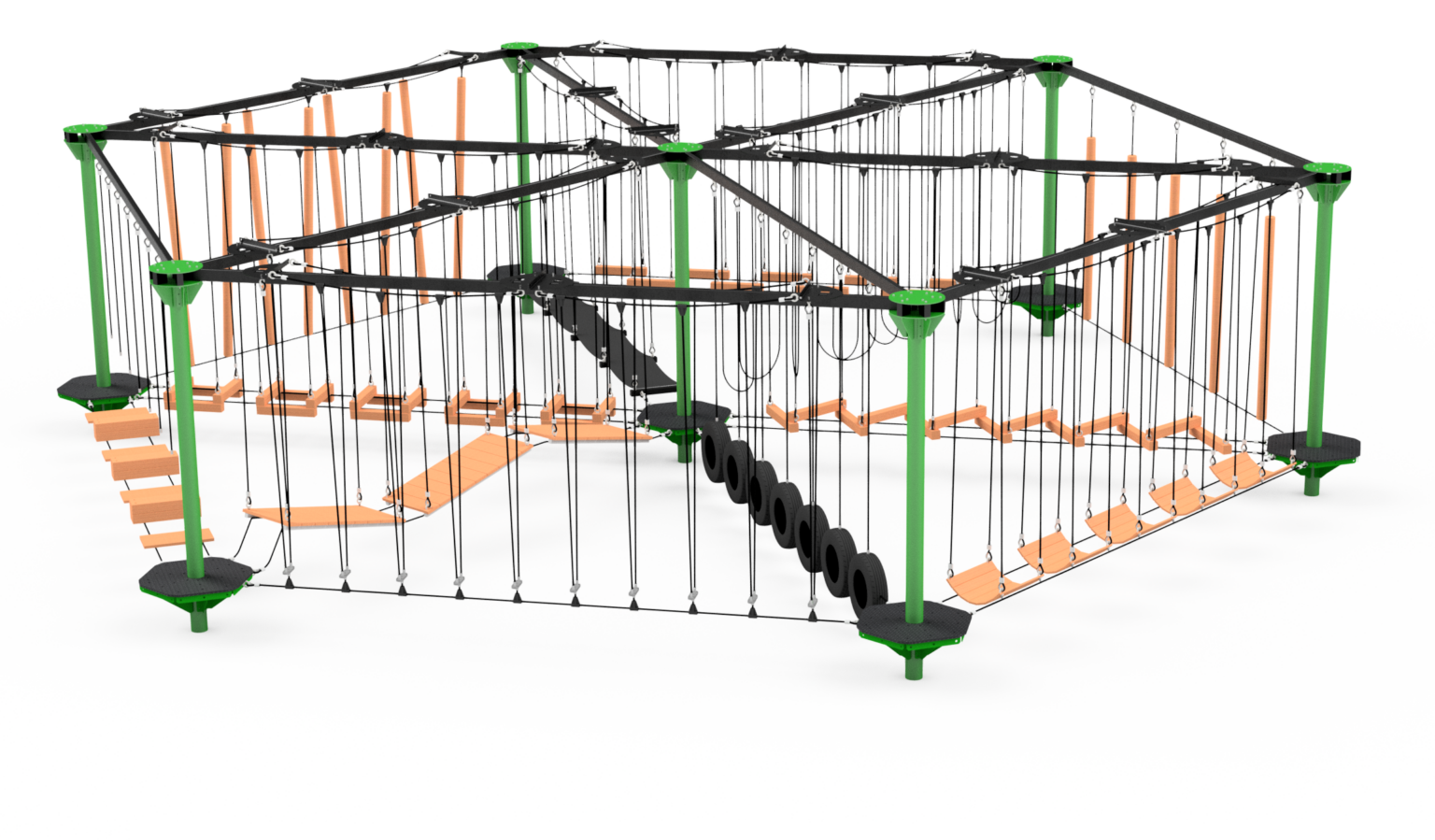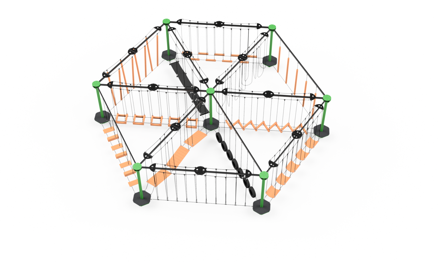 Een set van 12 unieke lage parcoursen, vormgegeven als gelijkzijdige driehoeken in een hexagonaal patroon, biedt een spannende ervaring voor kinderen, tieners en volwassenen. Ons touwpark is ontworpen voor jaarlijks publiek gebruik en is geplaatst op toegankelijke locaties, waardoor het ideaal is voor iedereen.