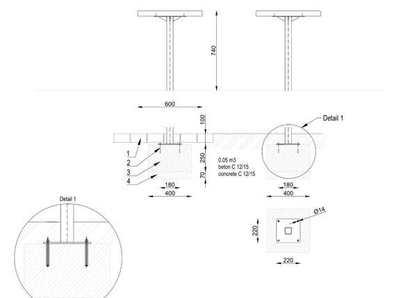 De tafel is naar keuze leverbaar voor montage op het maaiveld of een verlengde tafelpoot voor montage onder het maaiveld.
