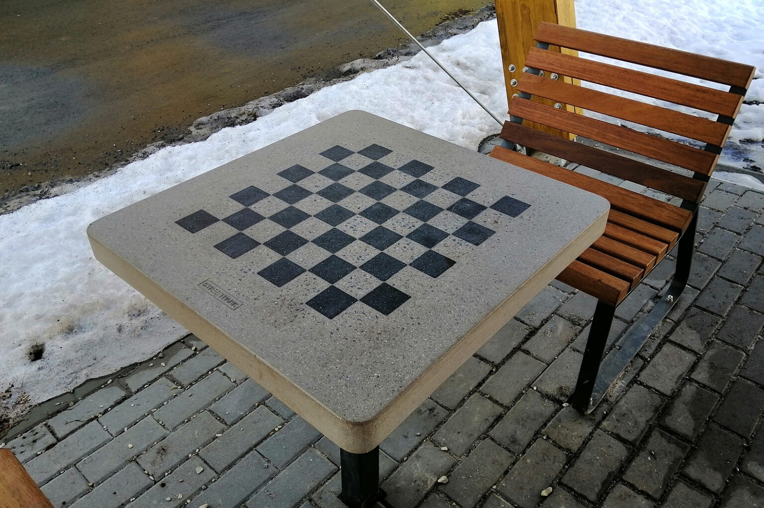 De schaaktafel van beton, klasse: C 30/37 met de vlakken ingegoten van zwart beton.