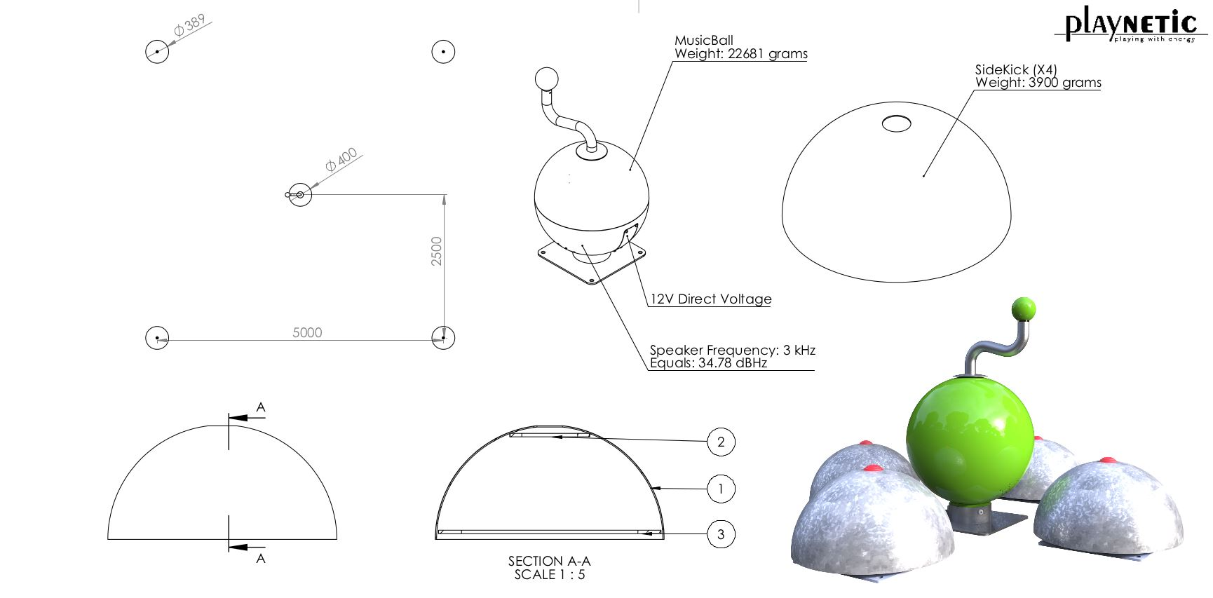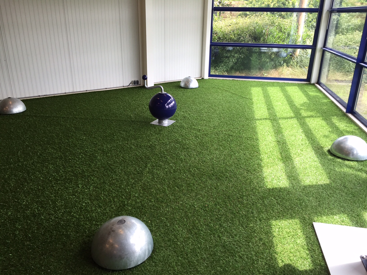 Houdt voor de plaatsing van de centrale bal met sidekicks rekening met ca. 42m2 vrije ruimte. (Speelveld van 5x5 meter plus rondom 1,5 meter vrije val ruimte).
