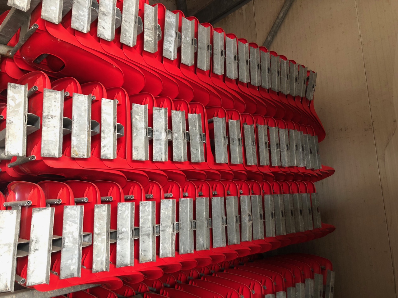 Voordelig en duurzaam. De looppaden en opgangen van deze tribunes zijn voorzien van 18 mm houtwerkplaten met dikke antislipmatten.