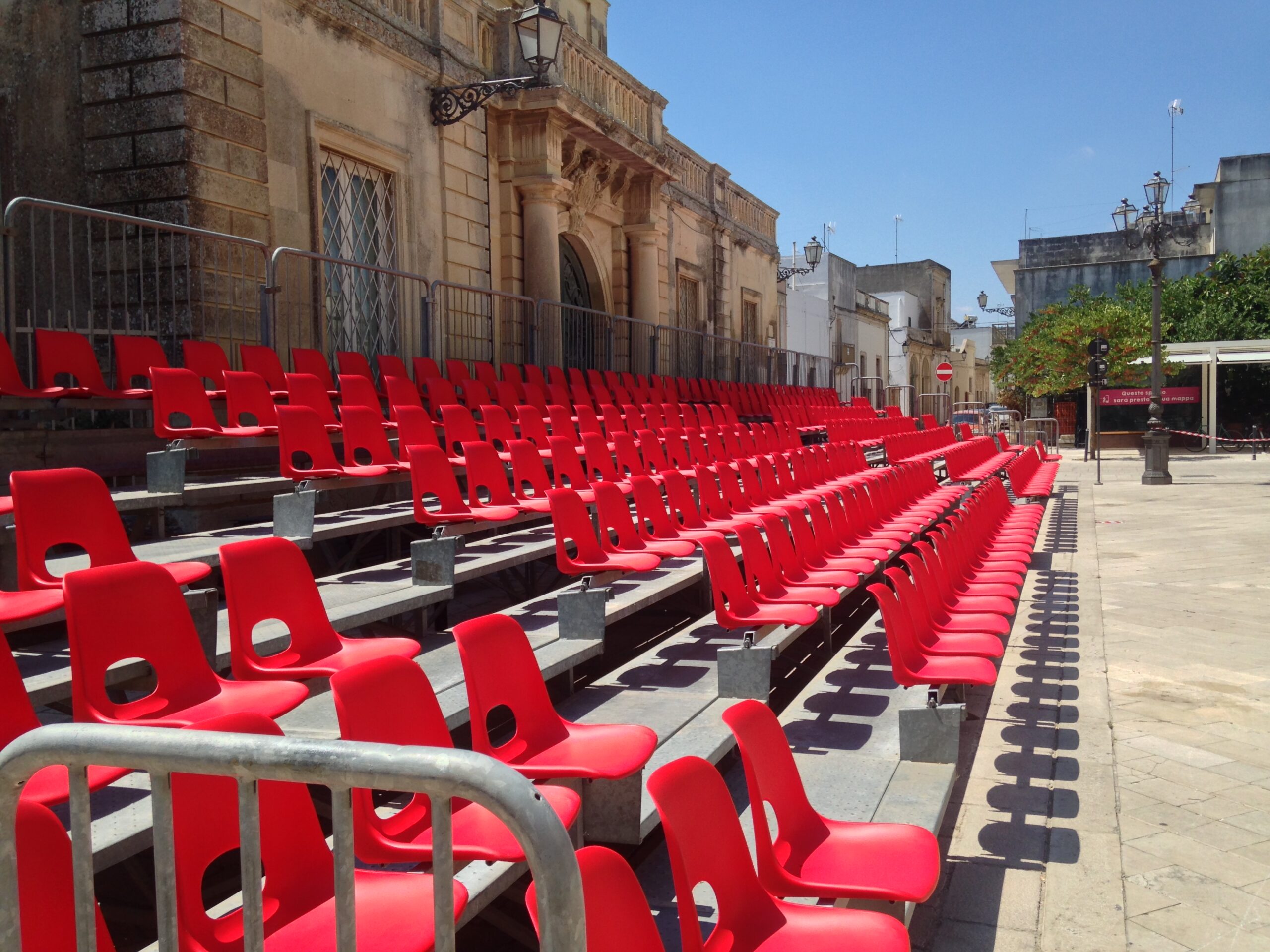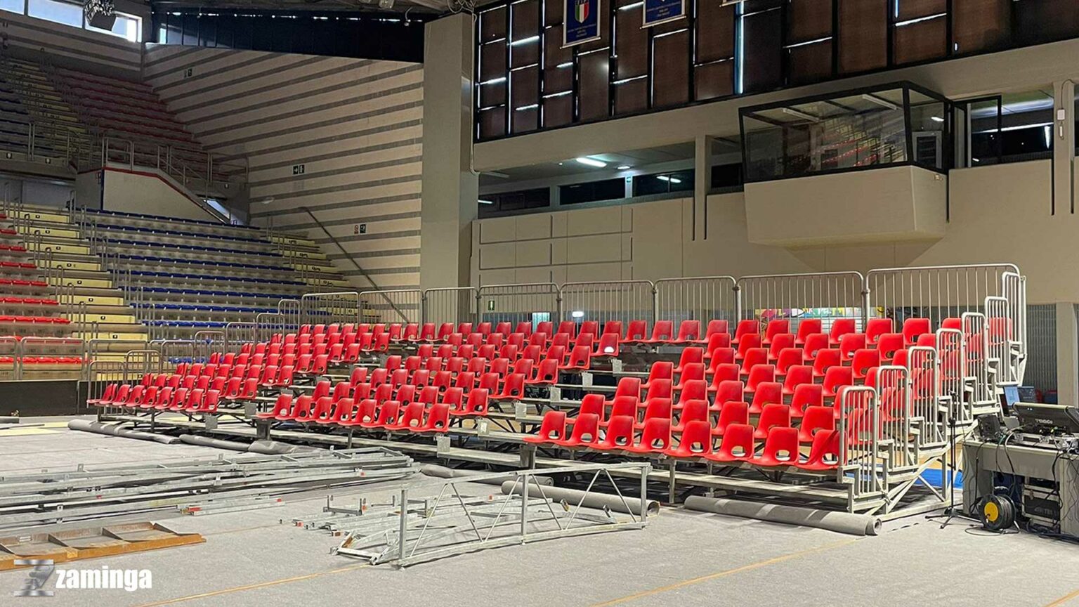 Een modulaire tribune met 5 zitrijen en 123 zitplekken, staat in 2 tot 3 uur met 4 personen.