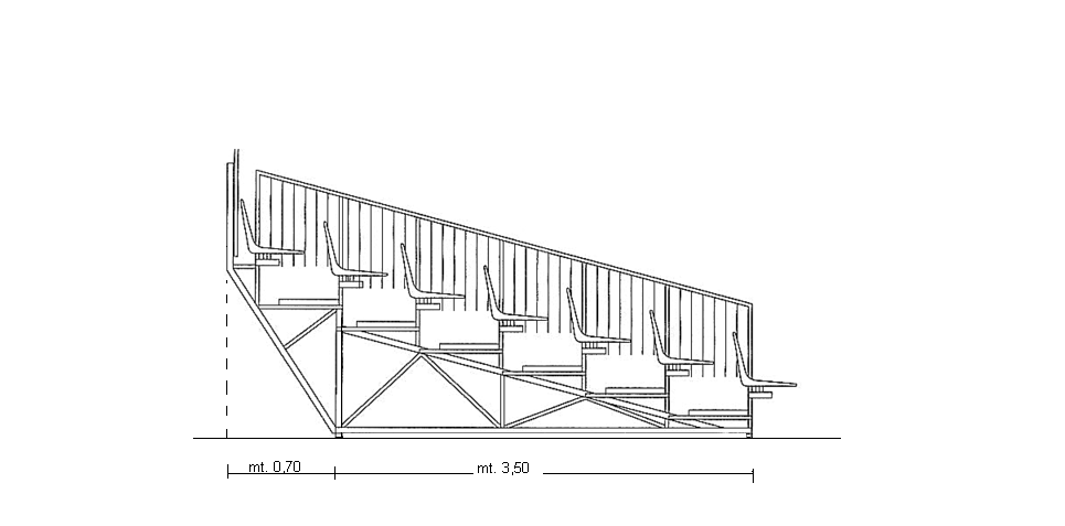 Principe tekening van deze bijzonder duurzame en veilige (aardbevingsbestendig) tribune in een maatwerk uitvoering met maar liefst 10 zitrijen.
