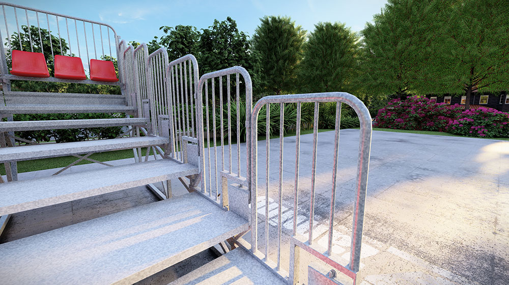 - Gegarandeerde veiligheid: Achter- en zijleuningen garanderen maximale veiligheid voor het publiek. Naleving van de geldende normen is voor ons een absolute prioriteit.