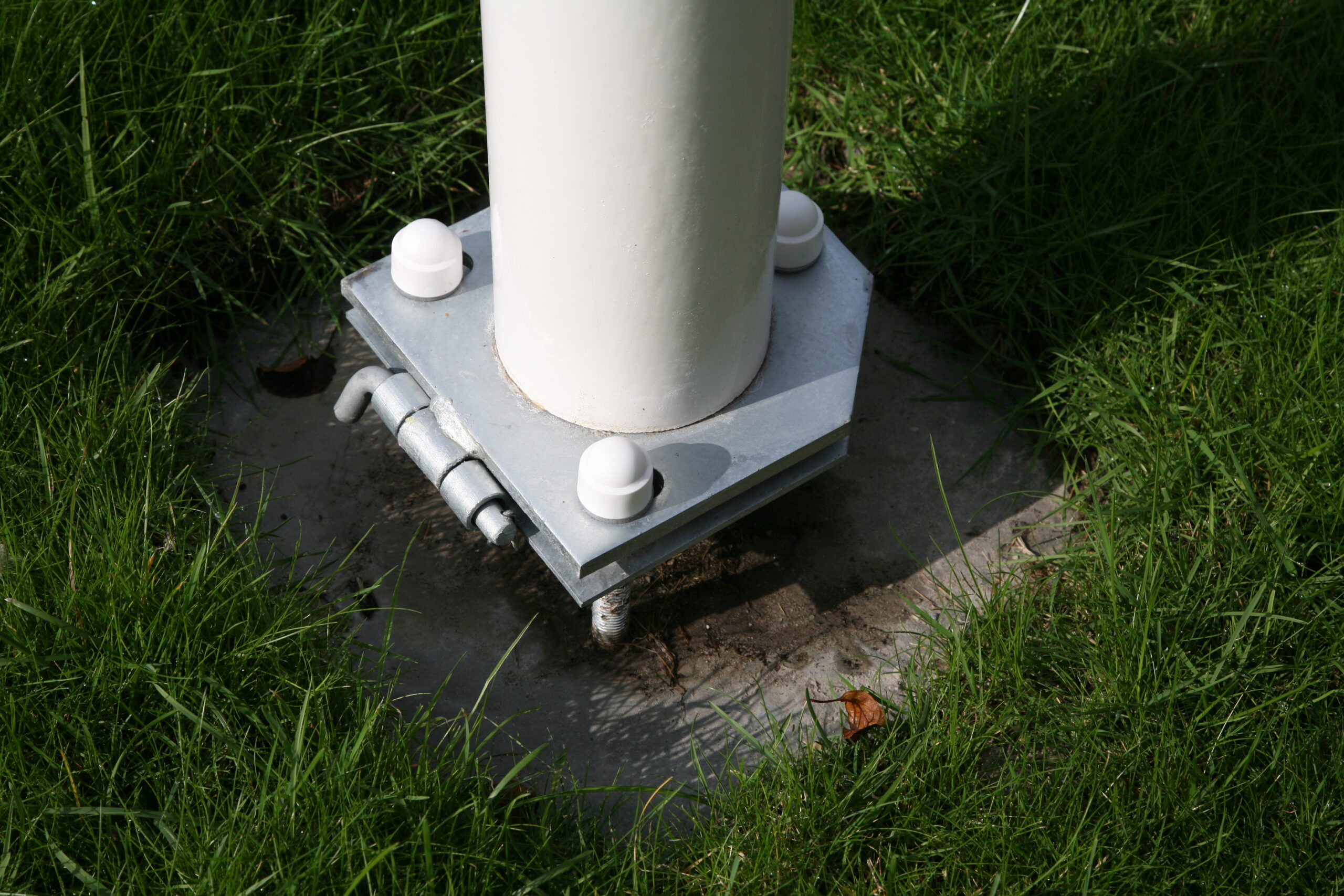 Cilindrische aluminium vlaggenmasten, leverbaar met grondkoker of kantelvoet.